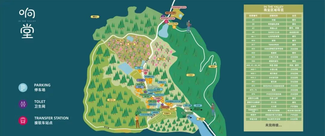 已开业主力店包括:栀咖啡(吴正梅主理)、大马营营地、新文房(陈卫新主理)、桐月春至(万俊主理)、打做(王克震主理)、宿里民宿(姚江波、万绮雯主理)、花迹·山野(胡守连主理)、村宴(陈晨主理)、栀味(张蓓主理)、不空(周付超主理)、回艺非遗(沙安强主理)、XIANG CLUB响堂户外俱乐部(南京市户外运动协会运营)、响堂直升机飞行营地(若尔航空运营)、响飞老山响堂滑翔伞(王震主理)、TERRAMOR(NEW ARC团队主理)、响骑·机车茶档(赵大宽主理)、云谷见野植艺美学空间(莫其翠主理)、抱云堂艺术空间(言恭达主理)。更多村屋正在招商,欢迎各行主理人与适合展售的艺术家及设计师加入。