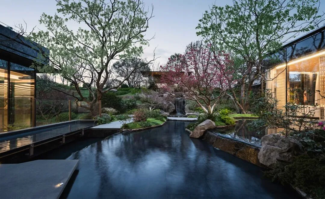 向下探索,向上生长,项目下沉庭院,借鉴南京芥子园“咫尺乾坤”的造园智慧,以叠石理水的手法形成三段式飞瀑,外引水韵、内生涟漪,将自然立体山水画境浓缩于一体。