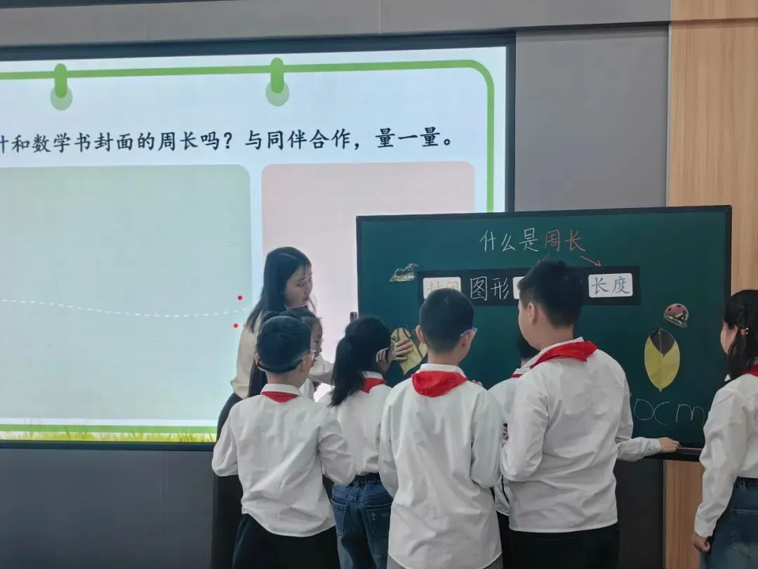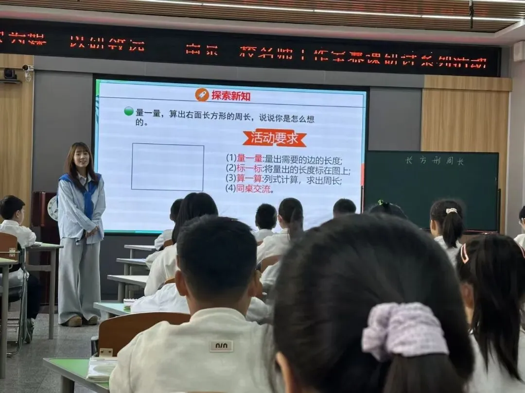 张家僮老师执教了数学课《什么是周长》。本节课的设计理念是“做中学”,引导学生从直观感知走向算法优化。课堂以学生熟悉的“给黑板贴花边”为情境,将抽象的数学问题生活化。核心环节是让学生动手测量长方形的长和宽,并自主探索周长的计算方法。通过小组讨论,学生会自然生成“长+宽+长+宽”“长×2+宽×2”和“(长+宽)×2”等多种算法。教师在此基础上引导学生对比、优化,理解并掌握最简便的公式。整个过程重在让学生亲历知识的形成过程,培养其探究精神和解决问题的能力。