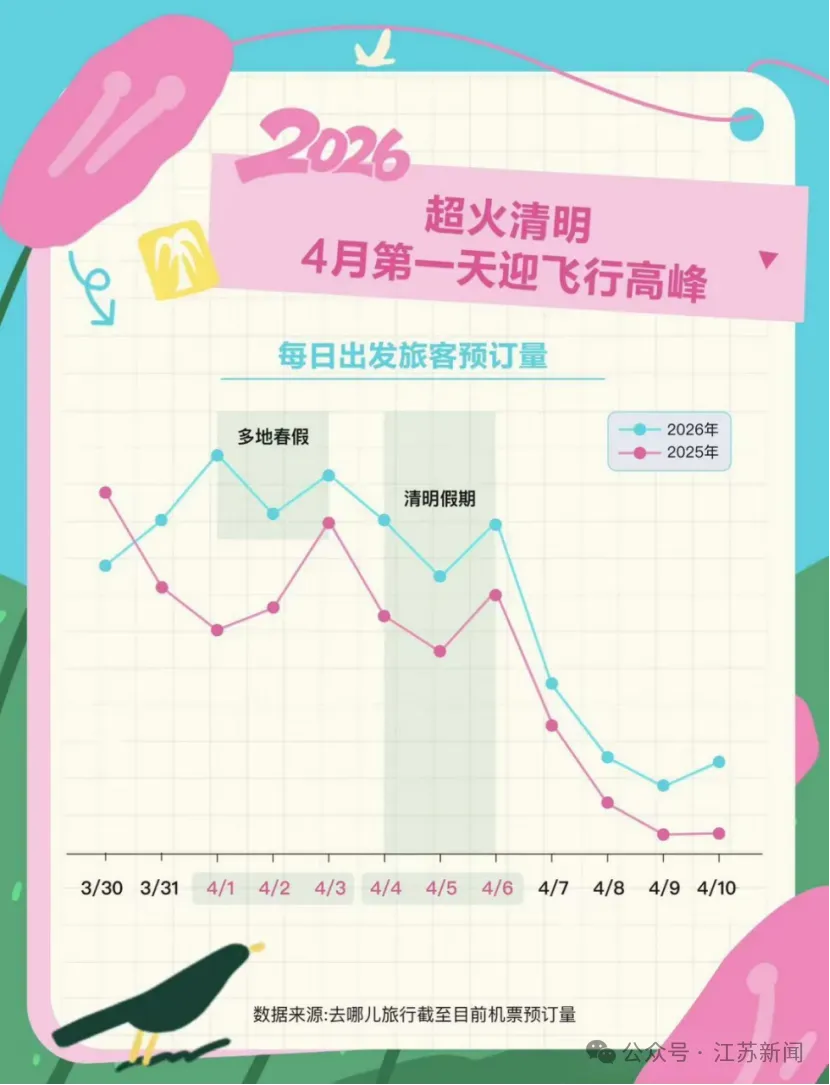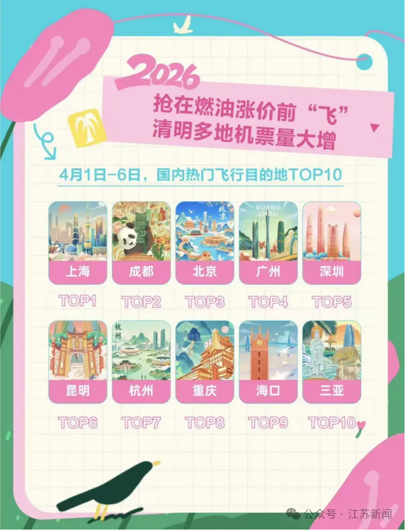 首次喜提春假的南京,4月1日乘飞机出发的机票量同比大增2倍。不仅是南京,江苏南通、常州、无锡等地的机票量也翻倍增长,家长们带着孩子飞往重庆、深圳、广州、泉州等南方城市,甚至远赴沈阳。