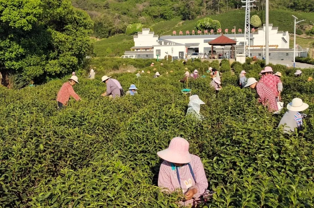 金花时节,千枝叠翠,万缕茶香。日前,记者走进花山田家茶叶种植专业合作社茶园基地,只见百余名采茶工穿梭于茶林间,指尖翻飞,抢抓时节采摘鲜嫩茶芽。