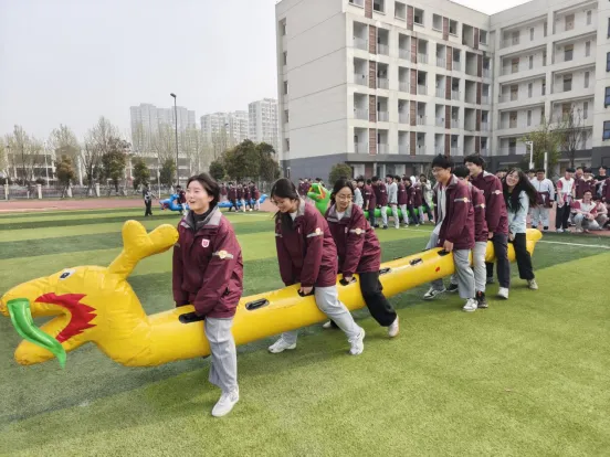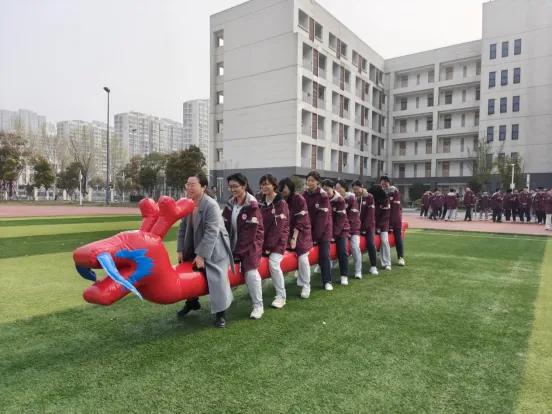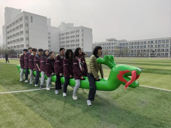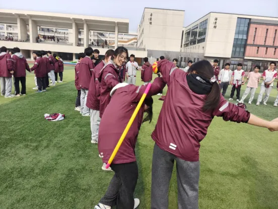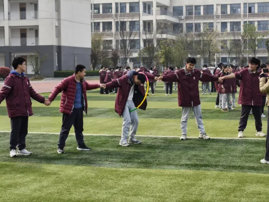 热身结束后,学生发展部副主任、心理老师孔祥波有序组织各类趣味团体游戏,层层递进、妙趣横生。在令行静止游戏中,同学们将手搭在前一名同学的肩上,全神贯注聆听口令,整齐划一完成动作,专注力与反应力在游戏中得到充分锻炼;紧接着的背向而驰游戏,要求大家做出与口令相反的动作,考验同学们的应变能力,现场笑声不断、趣味十足,同学们在默契配合中放下备考疲惫,尽情享受春日里的游戏乐趣。
