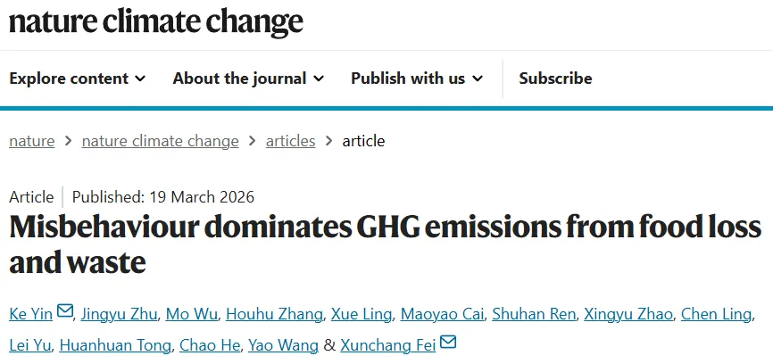 近日,南京林业大学生态与环境学院殷珂教授研究团队聚焦行为失范主导食物损耗与浪费(FLW)的温室气体排放,在《Nature Climate Change》(影响因子27.1) 上发表了题为“Misbehaviour dominates GHG emissions from food loss and waste”的研究文章 (文章链接:https://www.nature.com/articles/s41558-026-02596-y)。南京林业大学生态与环境学院殷珂教授与南洋理工大学费璕瑺教授为论文通讯作者,殷珂教授为论文第一作者,南京林业大学为第一完成单位。该成果得到南京林业大学标志性成果培育项目资助。