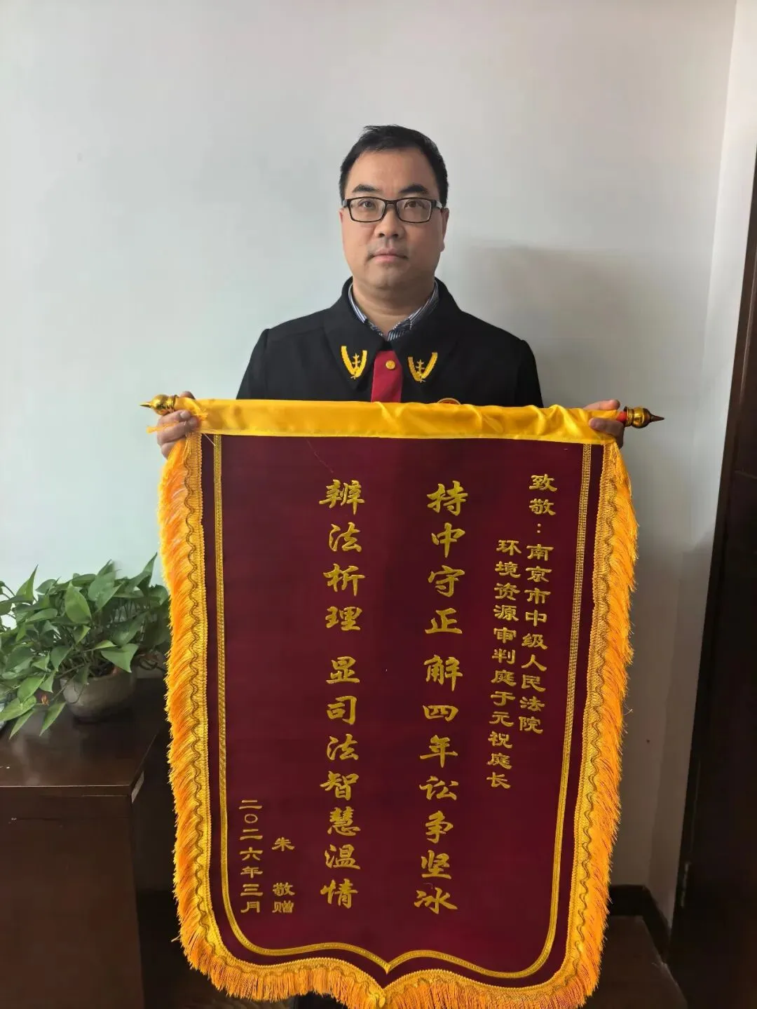 在此情况下,承办法官于元祝秉持“案结事了人和”理念,主动向双方当事人作出释明,多次组织双方协商、释明法律规定,在律师的配合下,引导双方摒弃对抗思维,围绕补偿事宜开展全面磋商。最终,双方达成和解协议,纠纷圆满化解,实现法律效果、社会效果、生态效果的有机统一。锦旗上“持中守正解四年诉争坚冰,辨法析理显司法智慧温情”的话语,既是对该案件审理效果的肯定,也是对我庭护航长江大保护、实质化解行政争议的高度褒奖。