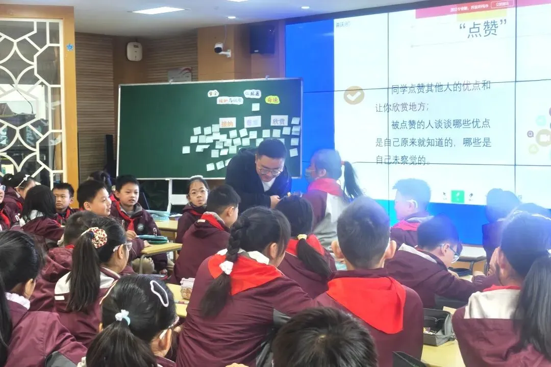 在热烈的分享与讨论中,“接纳”“尊重”“欣赏”三个关键词,成为了孩子们心中最温暖的答案。大家纷纷拿起纸笔,认真写下自己的优点贴在黑板上,同时也主动为身边的伙伴点赞,大声说出彼此的闪光点。当随机抽取到班级里的特需孩子时,全班同学都用最真诚的话语,诉说着他们的可爱与优秀,让包容与善意在教室里流淌。