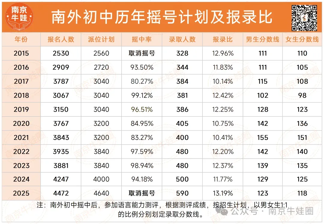 其中2025年南外招生计划增至580人,报名人数没有超过派位计划人数,进而今年取消摇号,所有报名的孩子均可以参加考试,给更多优秀孩子打开了大门。
