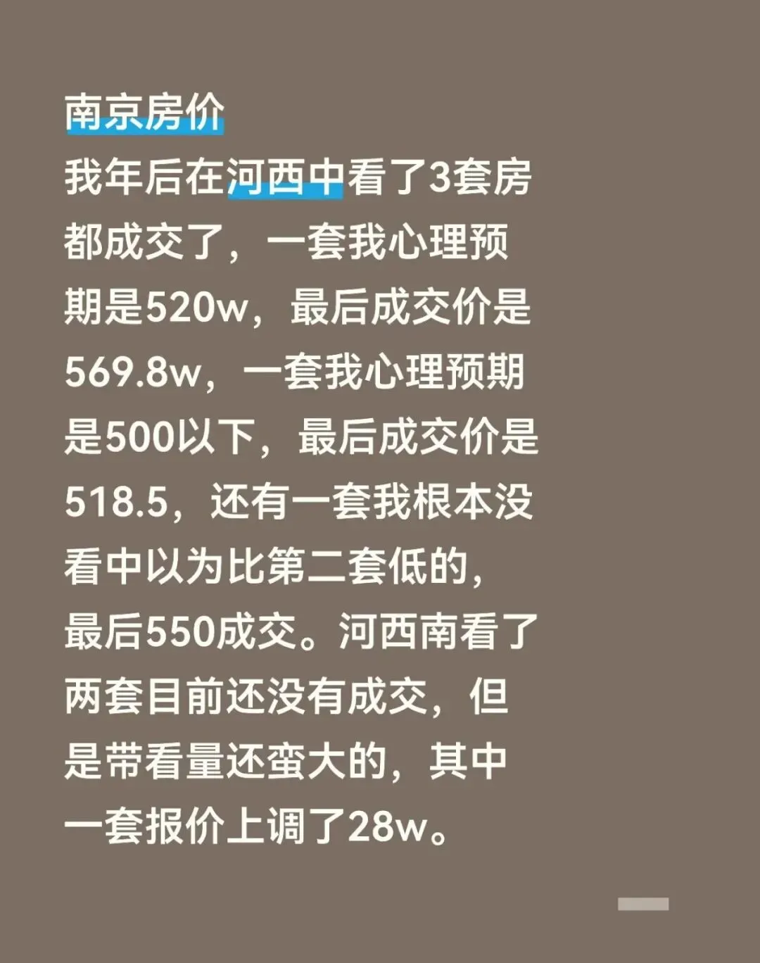 还有位购房者在小红薯吐槽,年后盯了河西3套房源,结果全被别人抢了先手,其中最贵的一套,比她的心理预期足足高了50万成交。