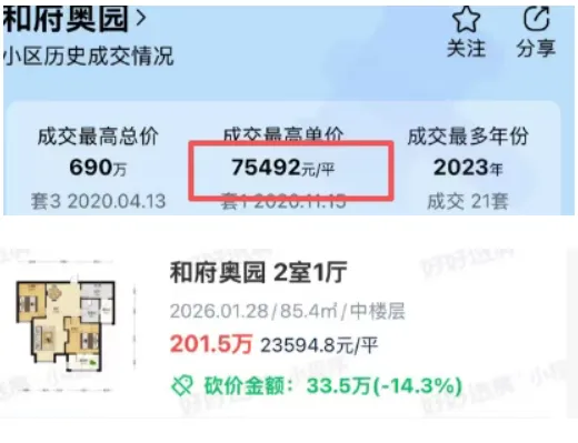 河西中部的和府奥园,鼎盛时期单价冲到7.5万/平,如今一套85平的两居室,201.5万就能拿下,单价仅2.36万/㎡;河西南的鲁能公馆,2021年峰值时单价7万/平,现在79平的小三房,207万就能成交,单价近乎腰斩。