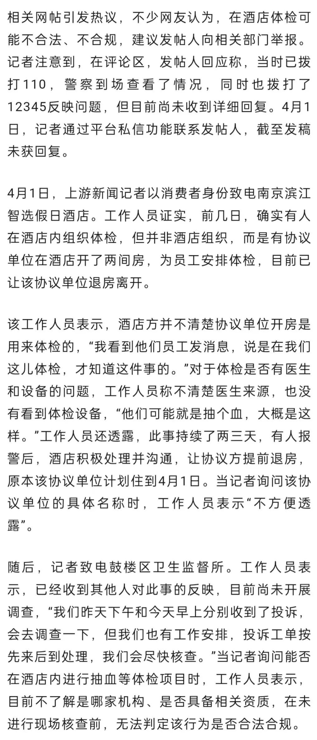 4月1日,上游新闻记者从该酒店获悉,有人在酒店体检的情况属实,但不是酒店组织的,而是协议单位临时开房用于体检,酒店事先并不知情。接到消费者投诉后,酒店已要求该协议单位退房离开。