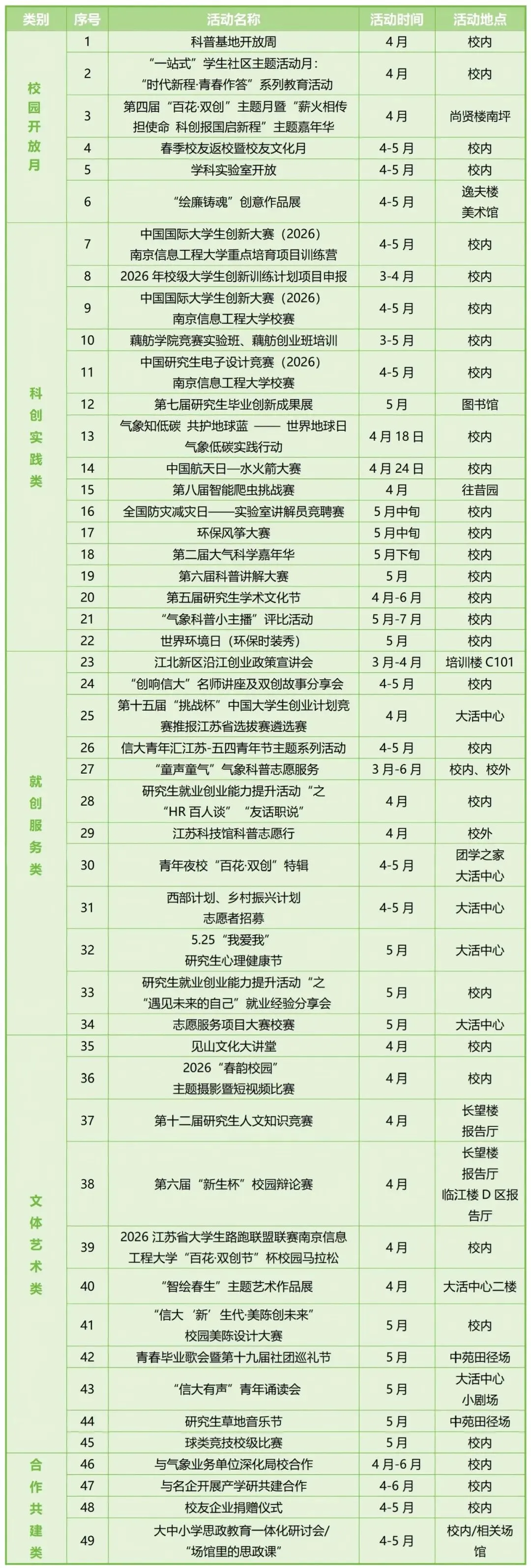 ➡️活动月期间,校内各类文化场馆、部分气象科普系列基地暨学科实验室,于4月1日至6日、4月部分周末,面向社会公众开放,并安排专业讲解。下面这份场馆和科普基地开放时间安排请收好咯!