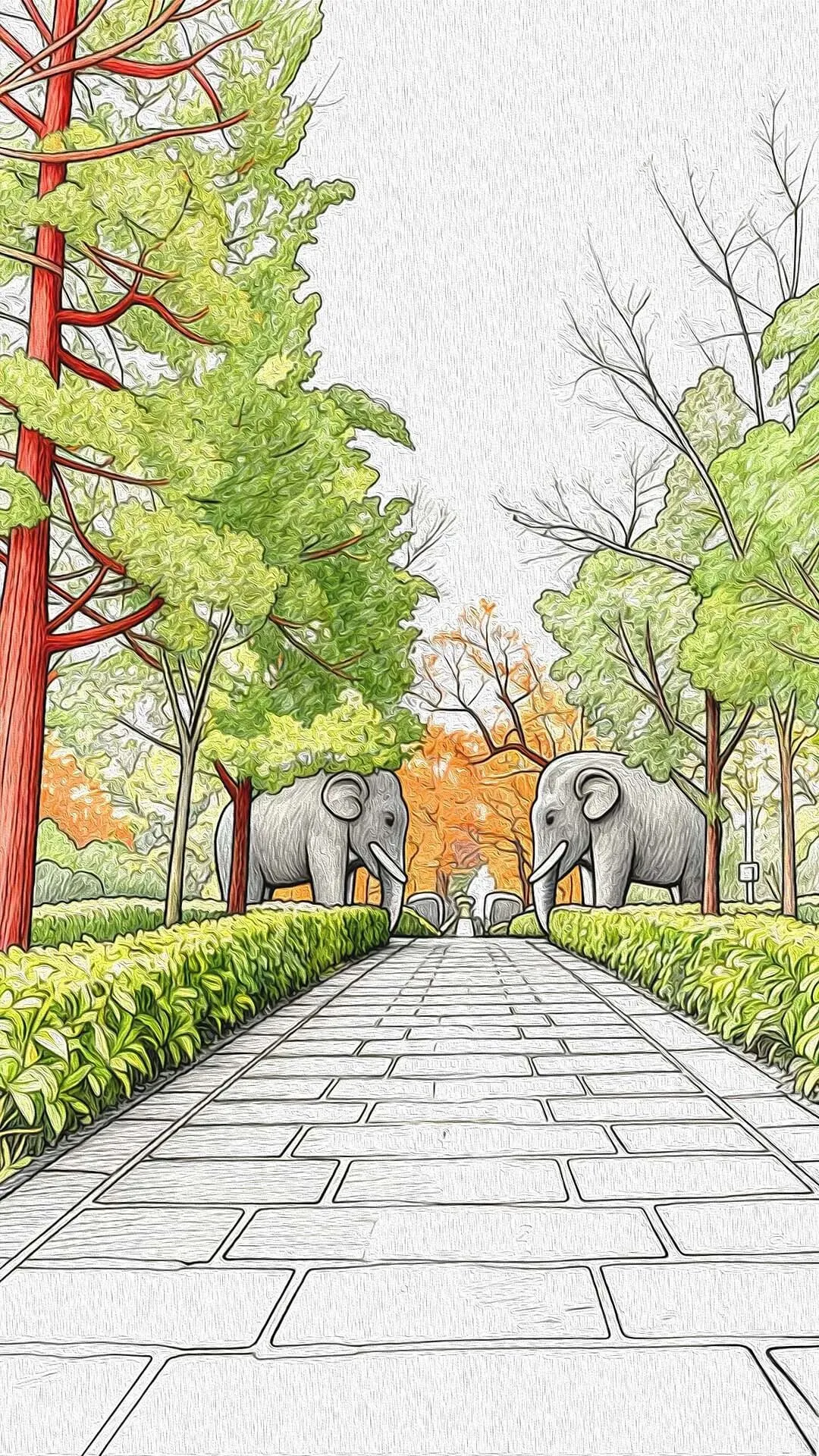 石象路,南京人叫它“最美600米”。明孝陵的神道,两边立着六种石兽,狮子、獬豸、骆驼、象、麒麟、马,各两对,站了六百多年。秋天一到,银杏黄、枫叶红,从路口铺到深处。走进去脚步就慢了,脚下沙沙响,心里静静的。老南京都说,不去石象路,这个秋天算白过了。