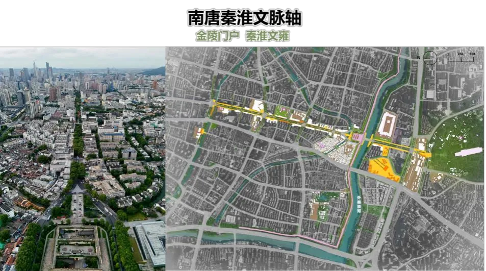 南唐秦淮文脉轴以南唐御街(今中华路)为主脉,北对鸡笼山(北极阁),南对雨花台接续红色文化,是体验金陵古都风雅秦淮、烟火城南的千年文脉之轴。