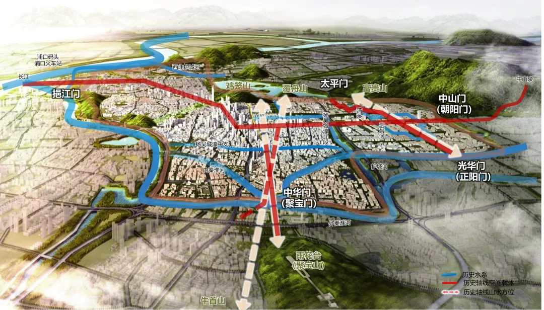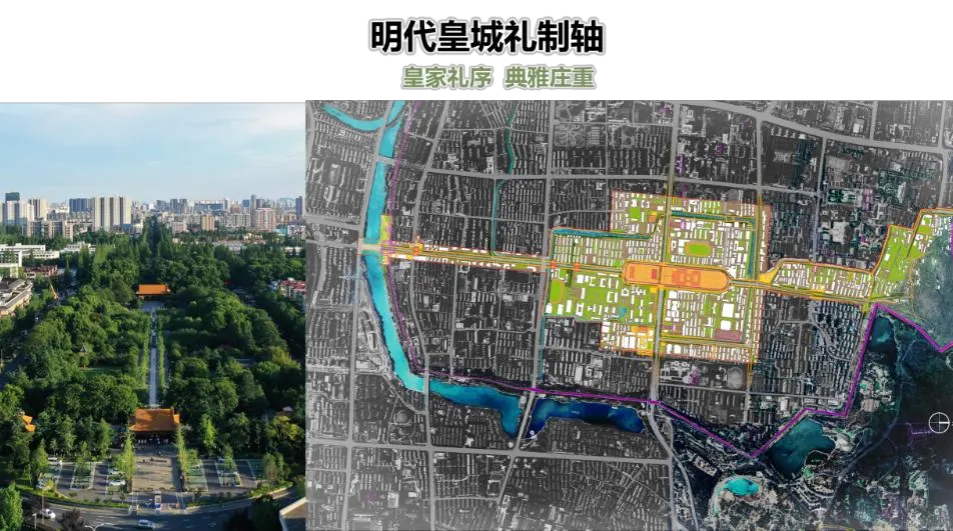 明代皇城礼制轴以明代御道(今御道街)为主脉,北对富贵山,南接秦淮河。能够体现明代大国气象,是宏伟都城的礼制之轴,是重释周礼“三朝五门”的中华礼制之轴。