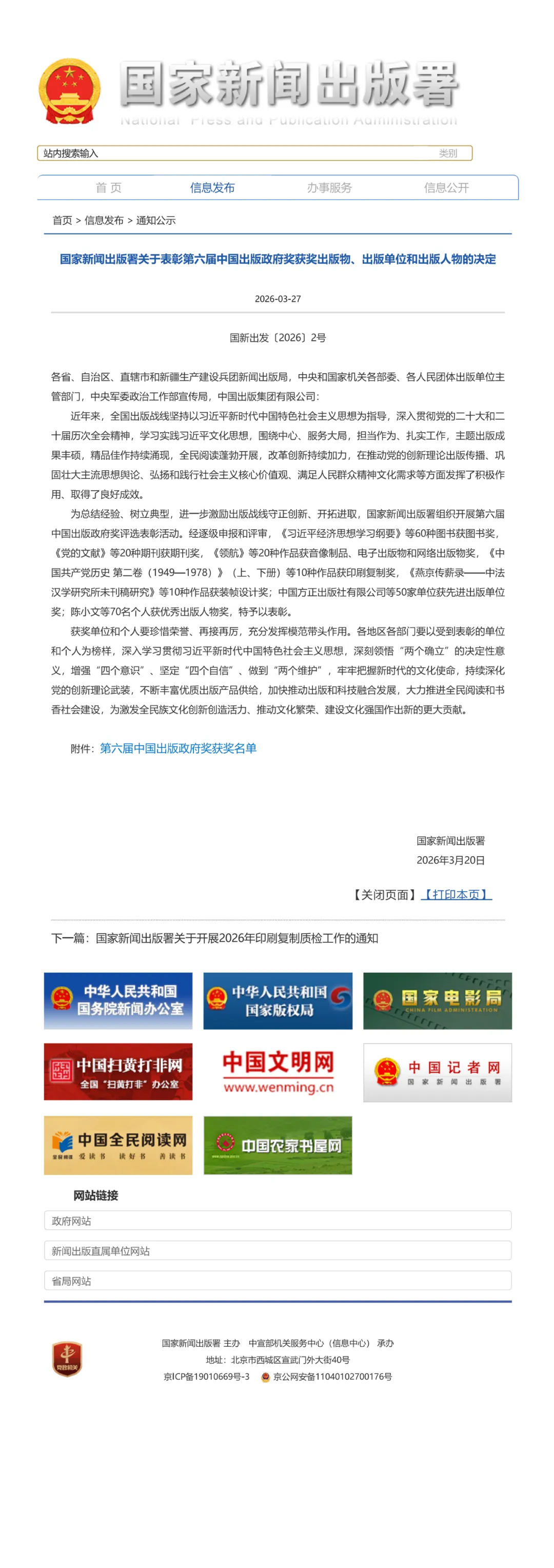 中国出版政府奖是我国新闻出版领域的国家级最高奖项,每三年评选一次,由国家新闻出版署主办,其前身为中国国家图书奖。该奖项以评选标准严格、竞争激烈著称,历经申报、评审、公示等多轮遴选,最终遴选出兼具思想性、学术性、艺术性与传播力的精品佳作,是国家级出版成果的最高荣誉,也是对创作者匠心与坚守的充分肯定。此次《〈诗经〉中的中草药》成功获奖,不仅体现了南京药育智能科技有限公司的创作实力,也标志着中医药文化与古典文学融合传播领域的一次重要突破。