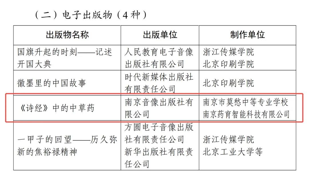 近日,国家新闻出版署发布关于表彰第六届中国出版政府奖获奖出版物、出版单位及出版人物的决定。由南京药育智能科技有限公司与南京市莫愁中等专业学校联合创编的《〈诗经〉中的中草药》从众多参评作品中脱颖而出,荣获第六届中国出版政府奖电子出版物奖。该奖项不仅是对南京药育在药学文化传承与技术创新方面成果的国家级最高认可,也彰显了其在“药学数智化教育”领域的深厚积淀与前瞻视野。