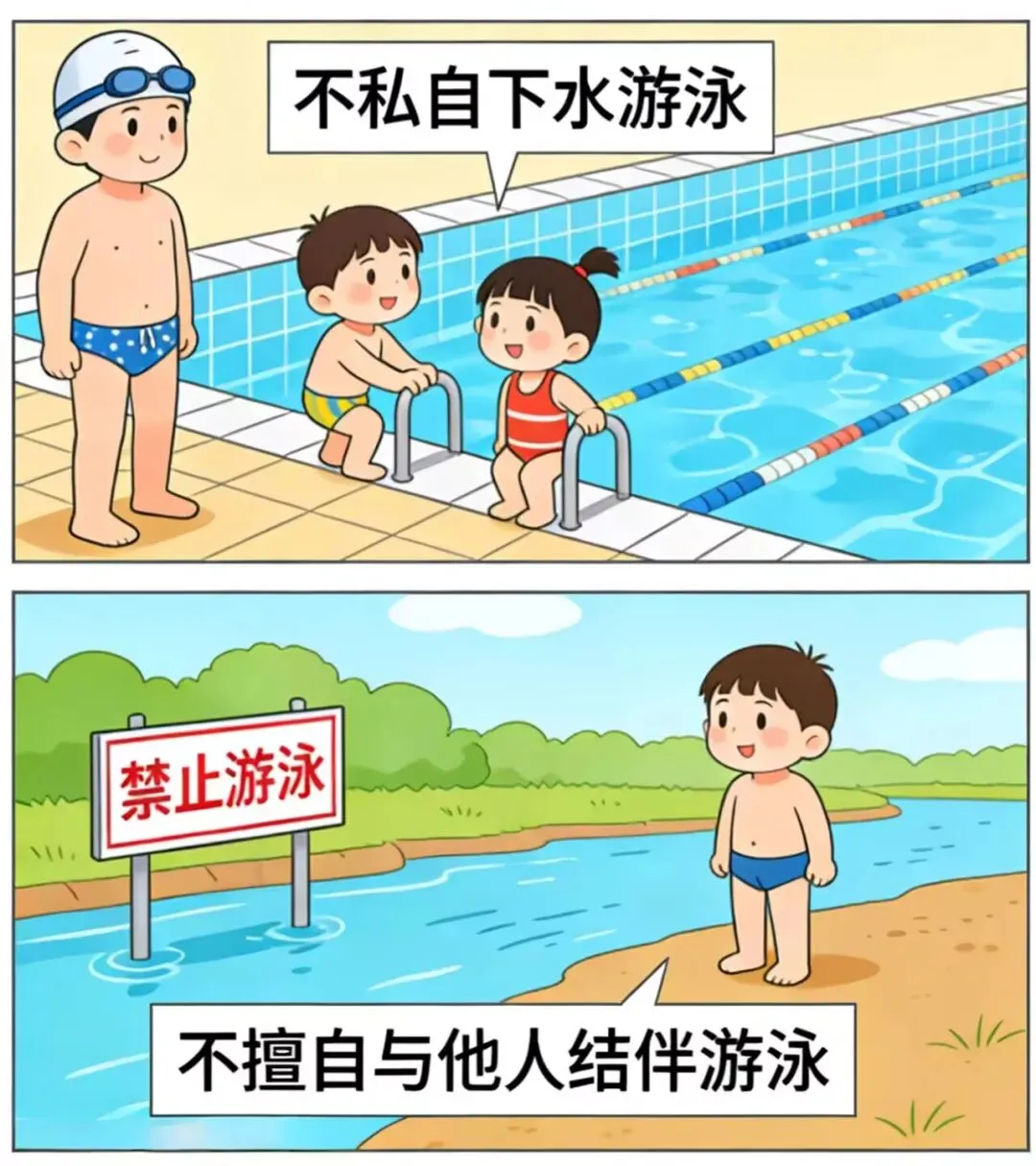 教育孩子牢记防溺水“六不”原则:不私自下水游泳;不擅自与他人结伴游泳;不在无家长或老师带领的情况下游泳;不到无安全设施、无救援人员的水域游泳;不到不熟悉的水域游泳;不熟悉水性的学生不擅自下水施救。发现同伴溺水,切勿盲目下水施救,应立即大声呼救,并拨打110或120求助。