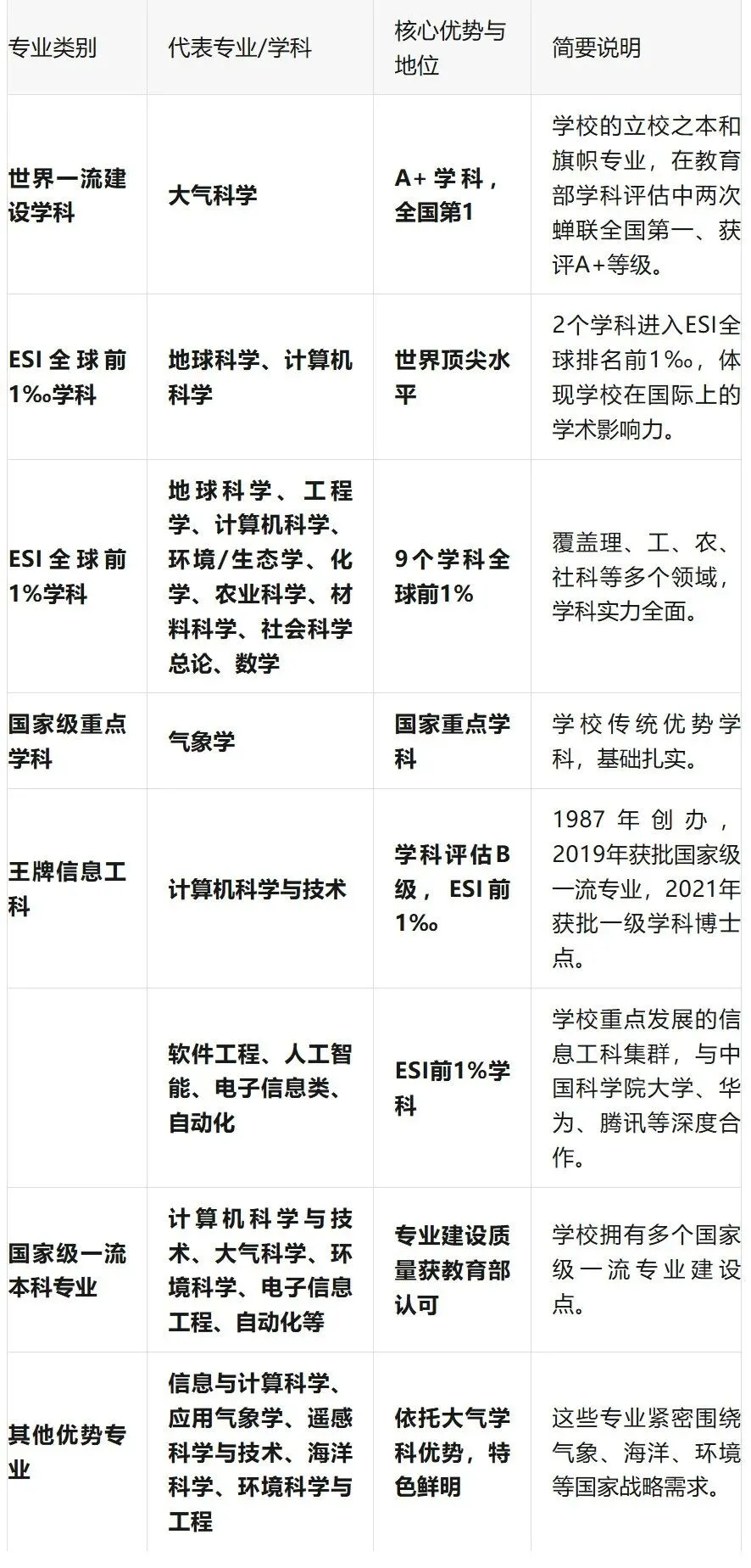 南京信息工程大学的优势专业以大气科学为顶尖特色,信息工科实力雄厚,多学科协调发展。下表汇总了其核心王牌专业及学科实力: