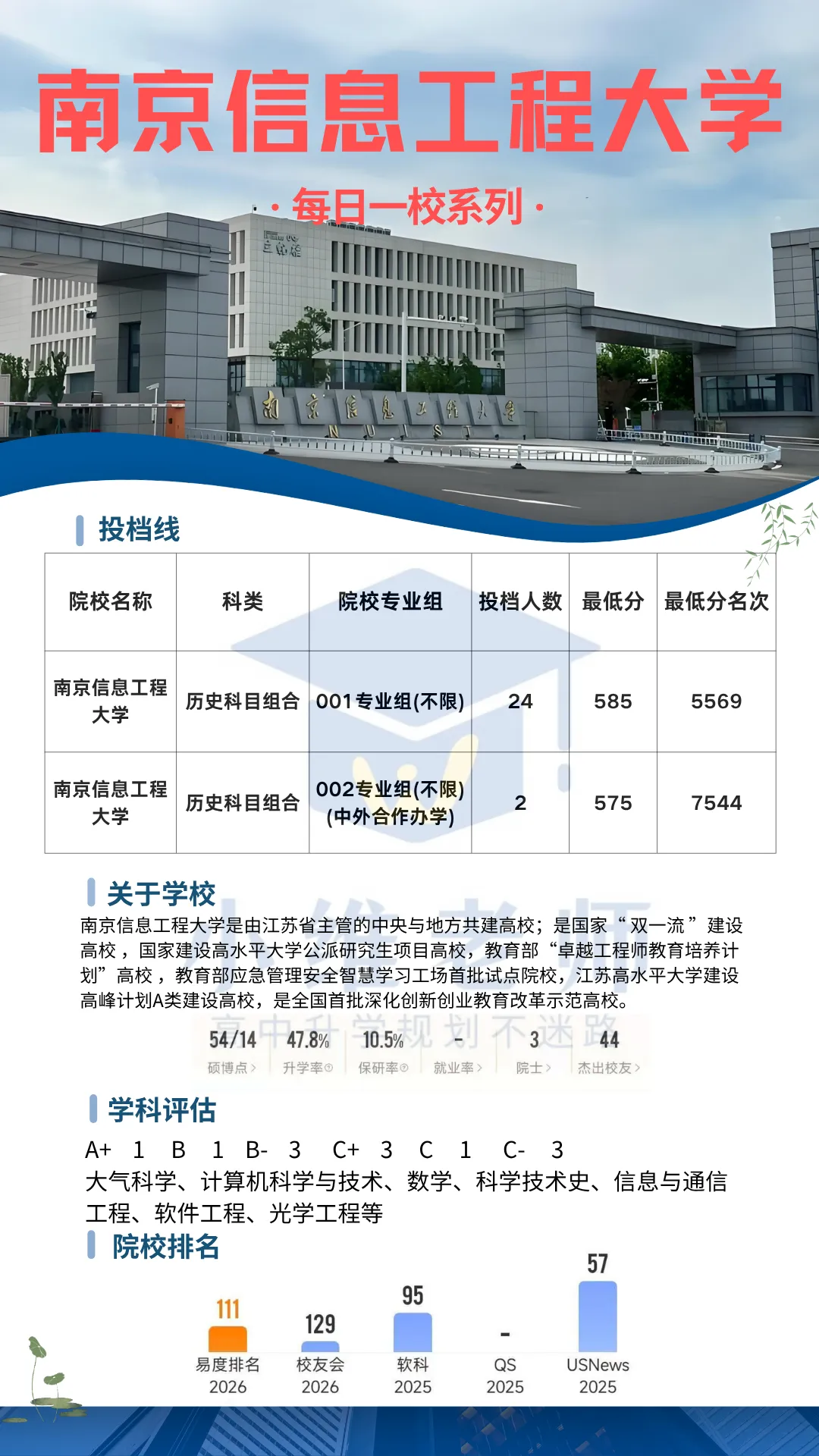 总结来说,南京信息工程大学是安徽省物理类位次在1.3万-3.4万名、历史类位次在5500-7500名的考生值得重点考虑的“双一流”高校。其全国顶尖的大气科学学科、快速崛起的信息工科、创新的拔尖人才培养体系、42.6%的本科生深造率,以及地处南京的地缘优势,为不同分数层次的考生提供了极具性价比的选择空间。