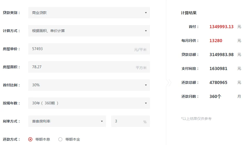 房主报价450万,按照首付3成约135万元,剩下商贷按照3%的利率,月供约13280元