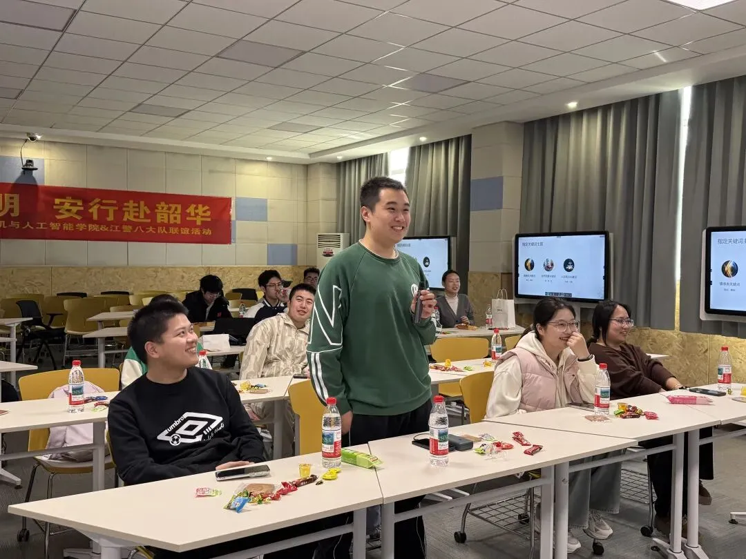 活动当日,南财学子在校门口热情迎接江警同学。在志愿者引导下,大家参观南财校史馆,老照片与馆藏实物在讲解中重现校史脉络,让两校学子在感受校园文化底蕴的同时,快速拉近距离。随后的 “过目不忘”“限时接词战”“歌词接力赛” 等互动游戏,在紧张与欢笑声中打破拘谨,为后续交流筑牢基础。