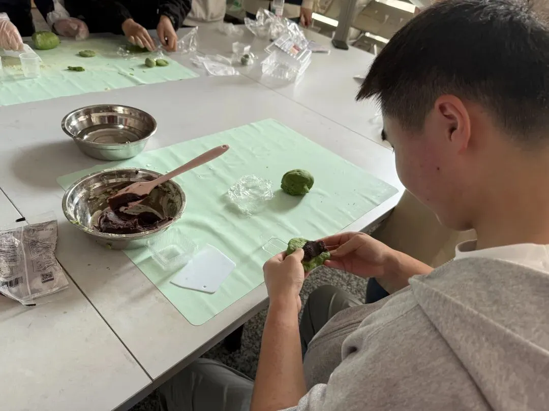 午餐后,德业楼内的清明主题实践活动成为核心亮点。青团制作区,桌上整齐摆放着青团预拌粉、温水、红豆沙馅、蛋黄肉松馅以及精致的包装盒。同学们将碧绿的青团粉倒入盆中,缓缓加入温水,一边搅拌一边揉搓。不一会儿,原本松散的粉末就变成了光滑柔软、富有弹性的面团。大家将面团分成均匀的小剂子,按压成圆片,舀入一勺自己喜爱的馅料——或是绵密的红豆沙,或是咸香的蛋黄肉松。轻轻收口、搓圆,一颗颗圆润饱满的青团便在掌心中诞生,散发着淡淡的糯米清香。同学们将亲手制作的青团小心装入盒子中,准备带回与朋友分享。来自江苏警官学院的一位同学笑着说:“以前都是买现成的,今天自己揉面、包馅,才知道青团这么做出来的,感觉清明更有味道了。”南京财经大学的同学则感慨:“一起揉面、一起装盒,就像提前过了一个温暖的清明节,还交到了警院的朋友,特别开心。”