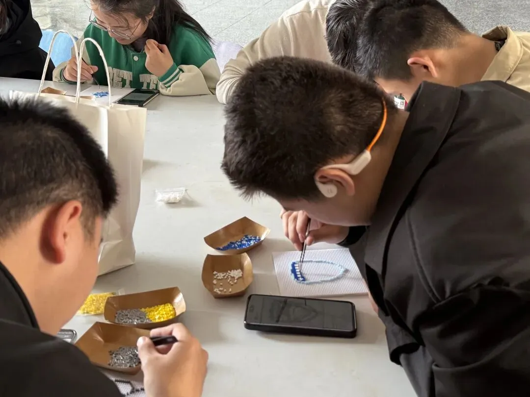 创意拼豆区同样热闹,五颜六色的豆粒在学子手中化为别样表达。除了春日花草、卡通形象,警营特色与红色元素格外醒目,有人拼出了毛主席戴军帽的经典头像,神情庄重而亲切,表达了对伟人的敬意;还有同学用红色和黄色的小豆子仔细拼出了中国共产党党徽——镰刀与锤头的图案在金色底纹上熠熠生辉,每一件作品都凝结着青年对党和国家的敬意、对革命先辈的敬仰、对职业的尊重。大家专注拼搭、加热定型,将校际情谊与清明追思融入方寸挂件。