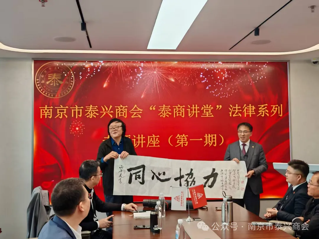 商会常务副会长、上海市协力(南京)律师事务所合伙人叶新介绍了策划讲座的目标和意义。南京师范大学教授陈仲明现场赠送墨宝“同心协力”。