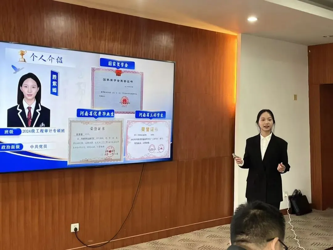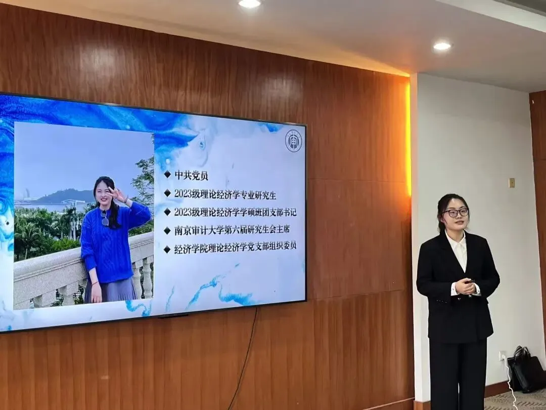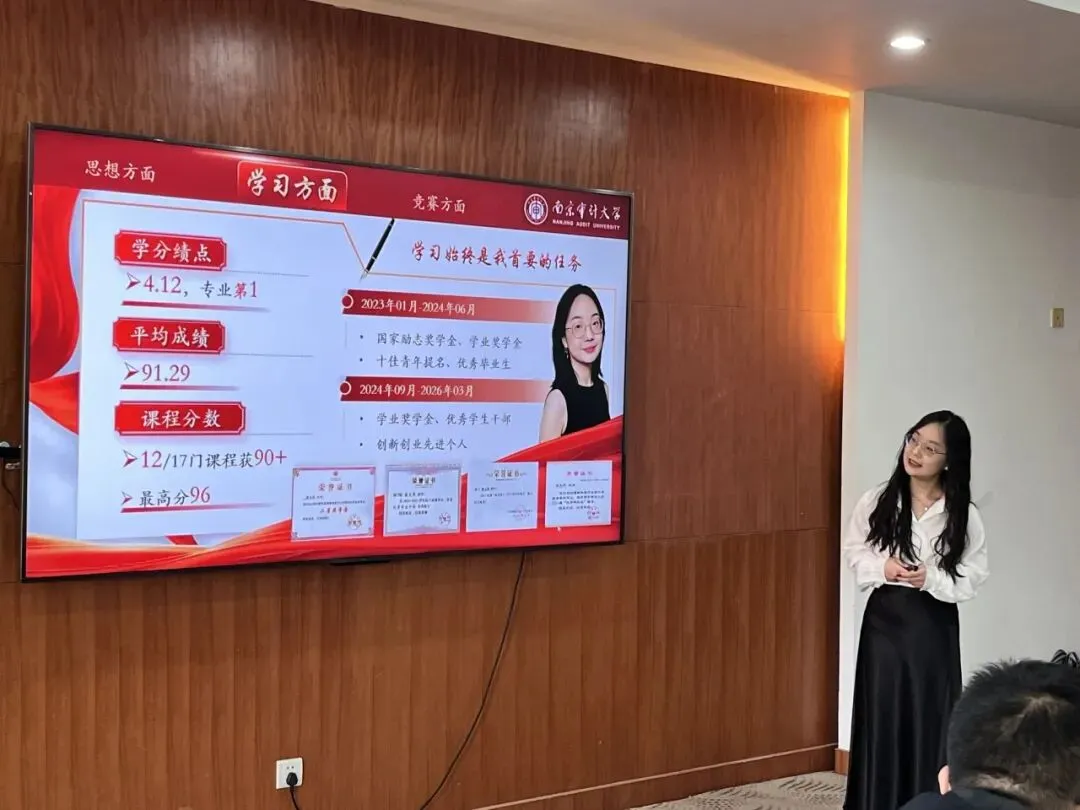 答辩现场,7 位候选人围绕学业科研、学术创新、学科竞赛、实践服务、学生工作等方面展开风采展示与现场答辩。他们中,有绩点专业第一、在 SSCI、计量经济学顶级期刊发表高水平论文的科研先锋;有荣获研究生国家奖学金、中国国际大学生创新创业大赛国家级银奖的创新标兵;有参与审计署专项审计调查、成果被审计报告采纳的实践骨干;也有深耕校园宣传、投身志愿服务、时长超200小时的青春榜样。