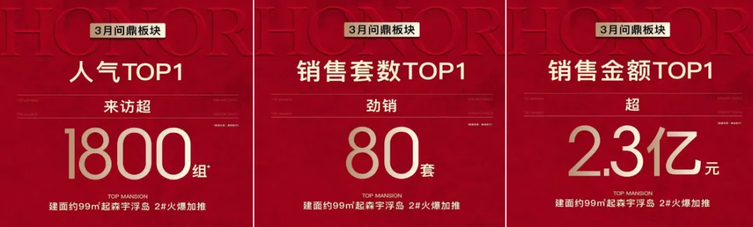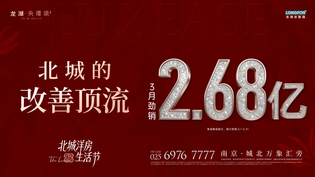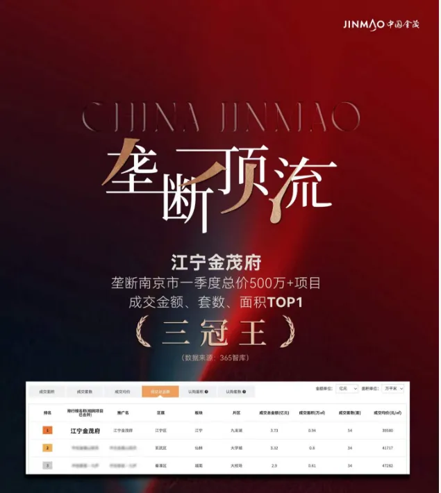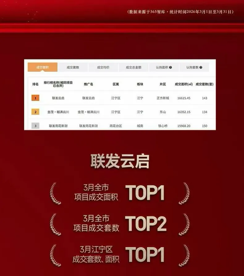 联发云启 全市项目销售面积TOP1(数据来源:365智库)国贸璟上,3月板块人气TOP1,来访超1800组+;劲销80套,销售套数问鼎3月份板块TOP1;热销超2.3亿元,销售金额板块TOP1(数据来源:案场统计)北城顶流,燕子矶的龙湖・北城央璟颂,单月劲销2.68亿的耀眼成绩(数据来自案场统计),不仅创下南京北城400-550万级改善产品月度成交新高,更以绝对优势领跑栖霞、鼓楼、玄武三区高改洋房市场。上城十号院,一季度成交2.6亿元,夺得套数、金额、面积、均价四项板块TOP1其实列举到这里,就能发现南京地产圈这一轮还有不少TOP级数据的项目没有被囊括进来。在此之前,营销天才们汇聚在汽车行业里,并在各大榜单中添加诸如“特定价格区间”“特定车型级别”“特定地区”“特定能源类型”等定语,将竞争对手排除在外,从而让自己成为“第一”。近两年来陷入困局的楼市,尤其是进入销售淡季的春节2月,房地产的存在感虽然很强,但伴随的也是众多争议,房价下跌、销量下降仿佛成为形容楼市的前缀词。在一轮又一轮的捶打之下,这些顺利从2024-2025年楼市低谷中蹚过来的房企,在不被看好的马年开端,拿到一个值得吹擂的成绩的房企/项目,本身就值得肯定。这个市场,不适合低调,能够亮出来的,就是当打的“武器”。在整体情绪萎靡行情之下,这些刷屏的房企,同样是在积极应对,某种程度上传导的不一样的市场情绪,房子,还有人在买,即使是两千万级别的豪宅。商务合作:周胜莲 18358597050(微信同号)