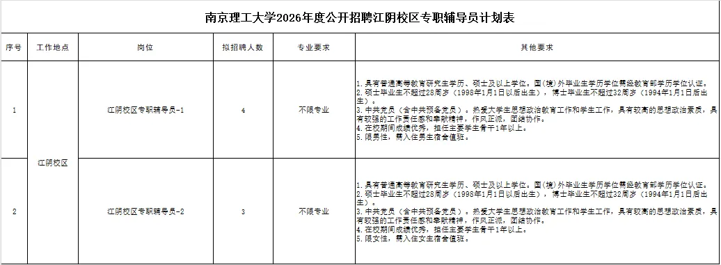 5.满足应聘岗位其他要求,详见《南京理工大学2026年度公开招聘江阴校区专职辅导员计划表》。