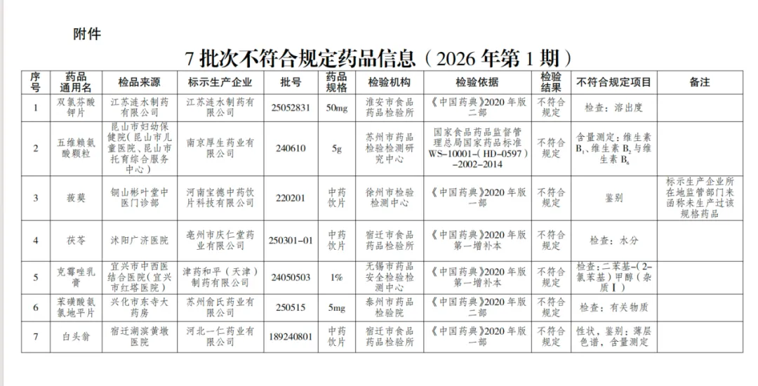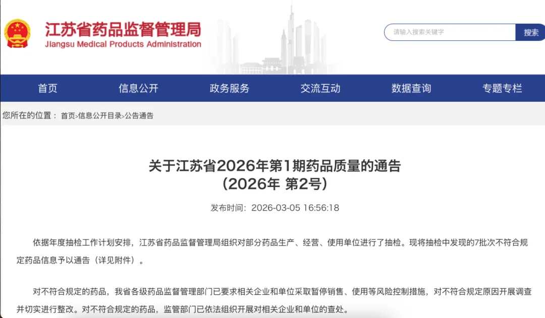 免责声明:本文信息均源自江苏省药监局官网通告、企查查及百度健康医典等公开渠道,仅作信息分享,不构成医疗建议或用药指导中国政府网。文中涉及的药品质量问题以官方通报为准,作者不对信息的完整性、时效性作绝对保证中国政府网。任何单位或个人依据本文内容采取的任何行动,责任自负,作者及发布平台不承担法律责任。本文非商业广告,不涉及药品推荐或销售引导国家卫健委。药品使用请遵医嘱并参照药品说明书,切勿自行判断或调整用药方案。本微信公众号文章均为原创,转载请事先联系微信ydsf3770,未经联系人同意和并签署作者名,将追究相关法律责任。