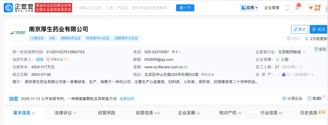 据《企查查》资料,南京厚生药业有限公司是一家集研发、生产、销售于一体的公司,主要生产心血管类、妇科类、儿科类、保肝类、抗病毒类等二十余种药品。
