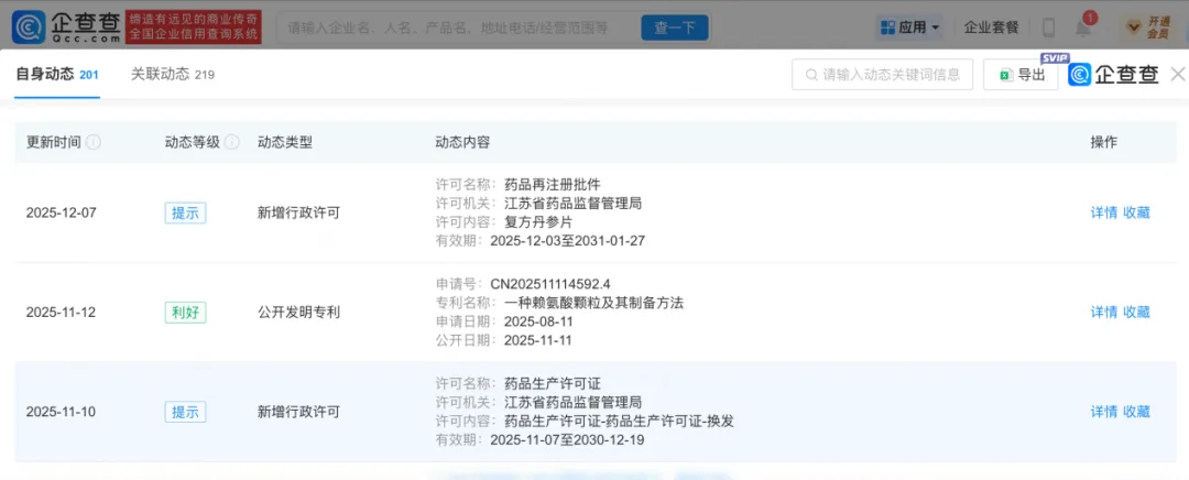 2025年11月10日,江苏省药品监督管理局刚刚给换发了该药企的药品生产生产许可证。同年11月12日,该公司“一种赖氨酸颗粒及其制备方法”获得公开发明专利。