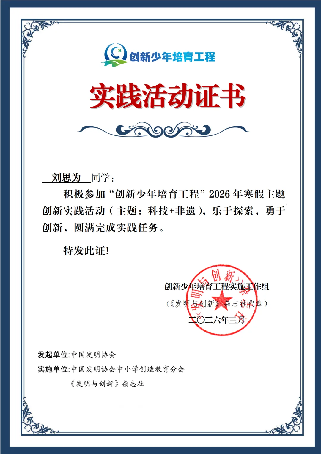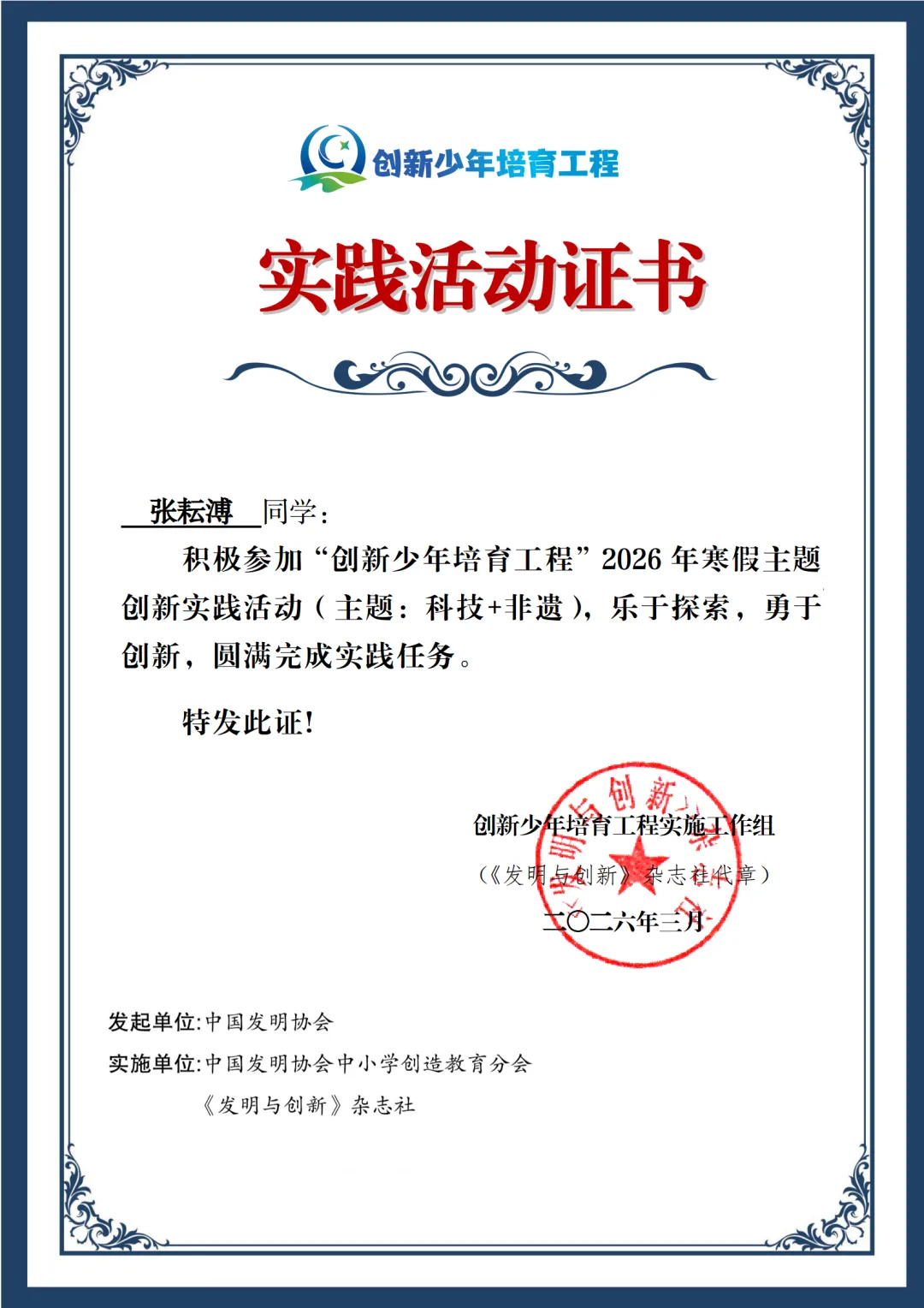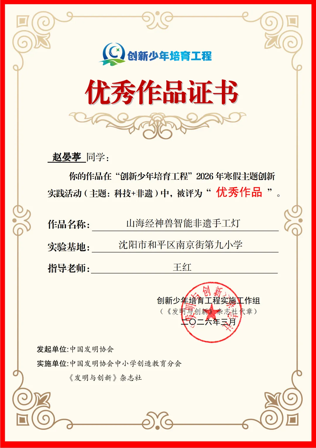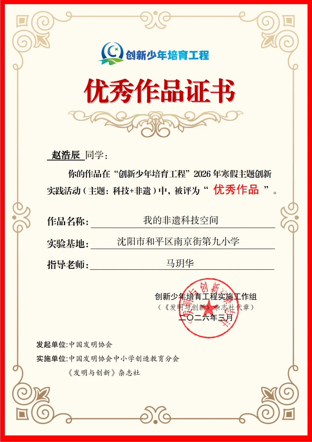 在刚刚结束的2026年寒假“当非遗遇见科技”主题创新实践活动中,南京九校组织学生积极参与,从众多上报作品中择优推荐21份作品参加国家级评选。经专家评审,我校报送作品全部获得证书,其中三年二班秦喧伊、四年八班赵浩辰、五年五班赵晏葶三名同学的作品荣获优秀作品奖,展现了学校在科技教育与劳动教育融合实践中的扎实成果。本次活动以“当非遗遇见科技”为主题,旨在引导学生深入感受中华优秀传统文化的魅力,运用现代科技手段对非物质文化遗产进行创造性转化与创新性发展。学校高度重视,假期前即通过线上平台发布活动通知,明确各年组作品要求,鼓励学生结合自身兴趣与特长,在传统手工艺制作基础上融入科技元素,让非遗在创新中焕发新生。