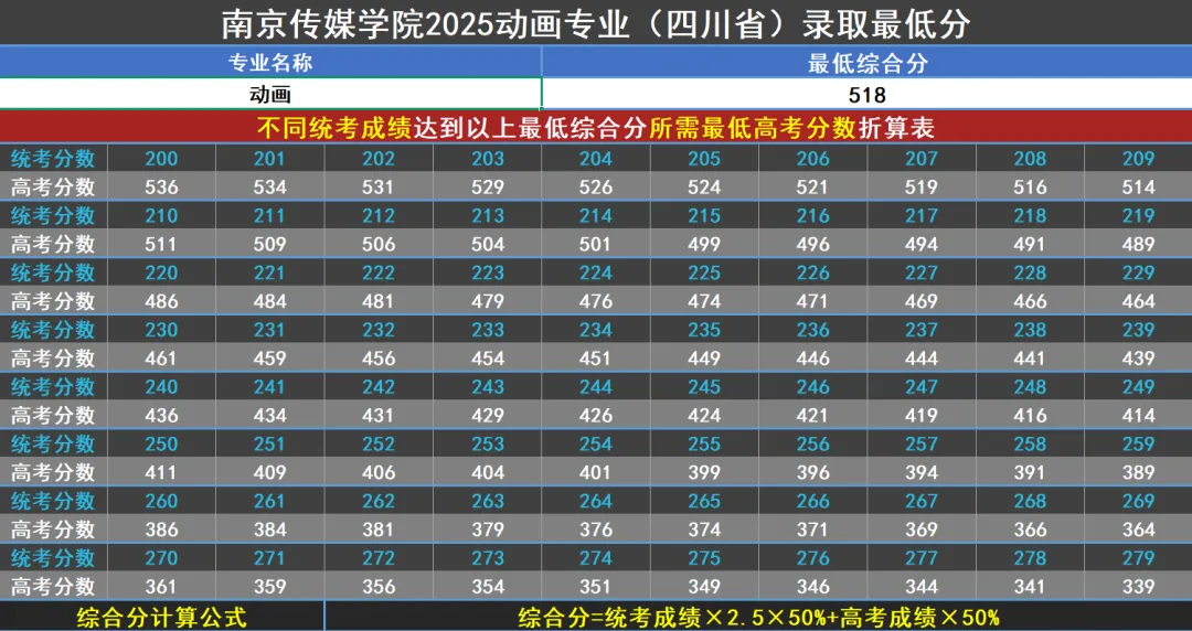 >南京传媒学院2025年动画专业(四川省)录取最低综合分对应文化和专业要求