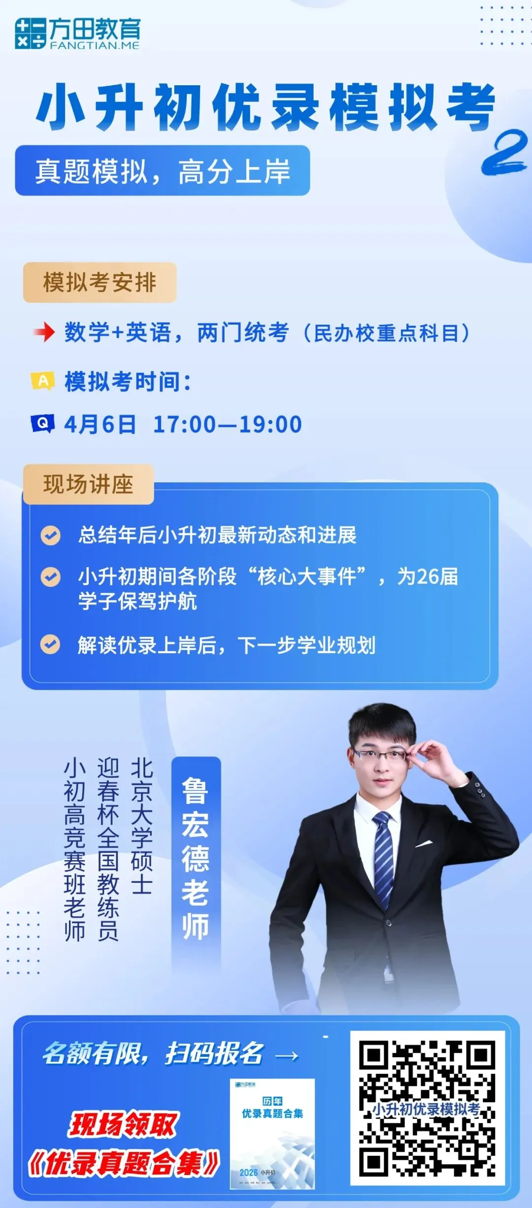 优录备战,模考先行!为了让小升初学生们感受一下优录考的难度和题型,方田准备了一场【优录模拟考试】,时间定于4月6日(周一)晚上17:00-19:00,考核数学和英语两门科目,详情戳下方海报👇
