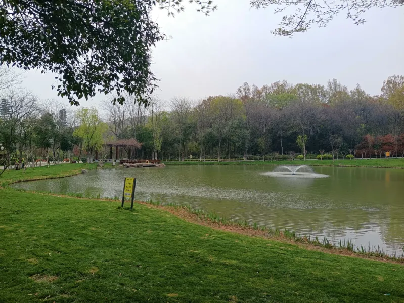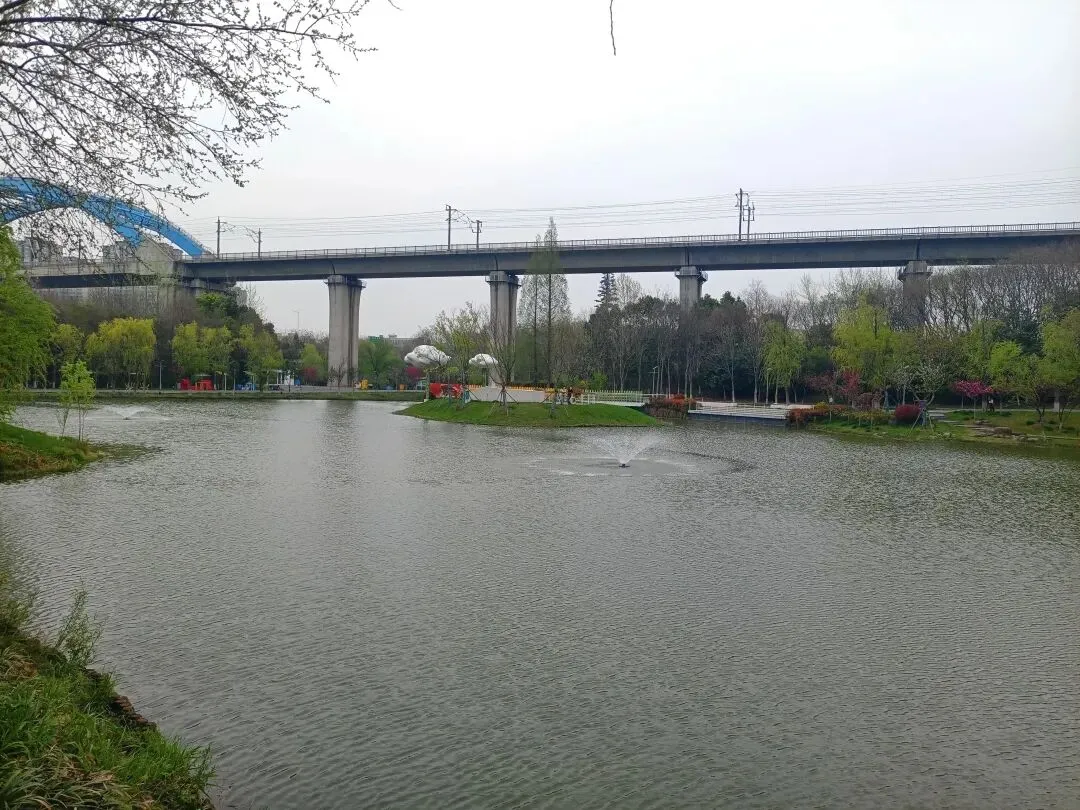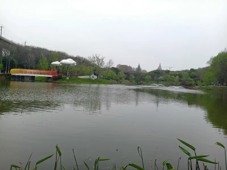 除了纵贯南北的绕城公路,公园北侧上空,还有飞架东西的宁沪高铁桥梁。由于公路、铁路尽与公园交织,所以这里尽管地域广阔,但身处其中,始终伴有汽车的嘈杂声,时时还有高铁动车的呼啸声。但是,园景却是林湖相伴、草木苍翠,加之繁花点缀其间,景致宜人,空气也清新自然。