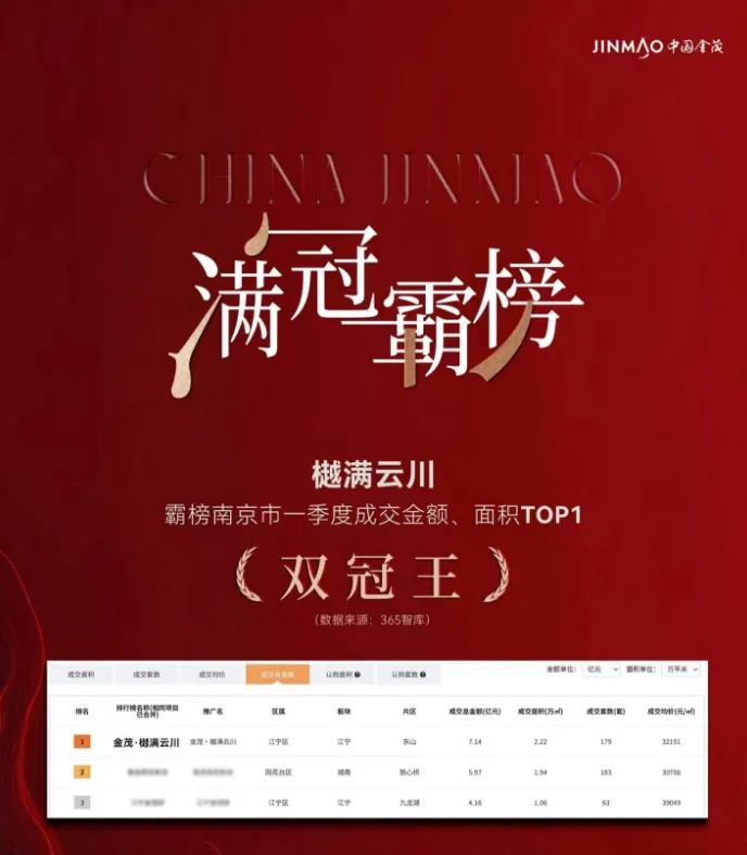江宁金茂府,垄断南京市一季度总价500万+项目,荣膺三冠王,成交金额、套数、面积TOP1