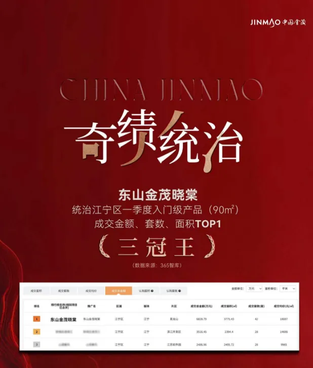 东山金茂晓棠,统治江宁区一季度入门级产品(90㎡),夺得三冠王,成交金额、套数、面积TOP1