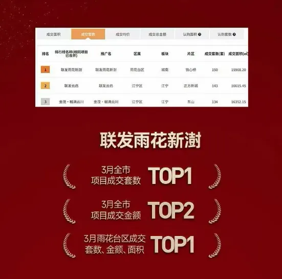 南京瑞玺,3月份蝉联,荣获一季度全市1000万元以上面积、套数、金额、均价TOP1