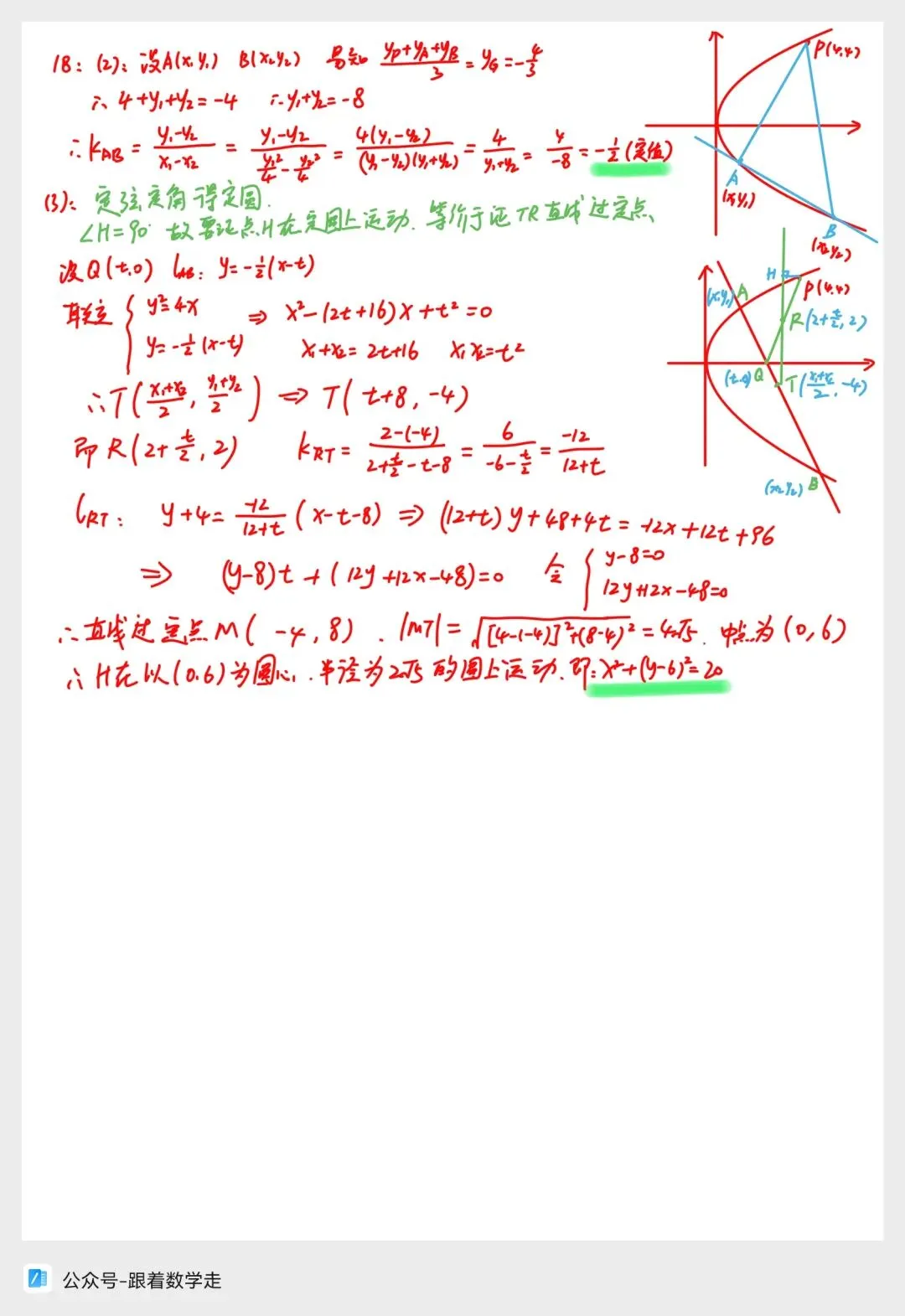 十八题,隐圆轨迹问题,看见直角一定要想得到等价于直线过定点,然后转化与Q点坐标的单变量问题