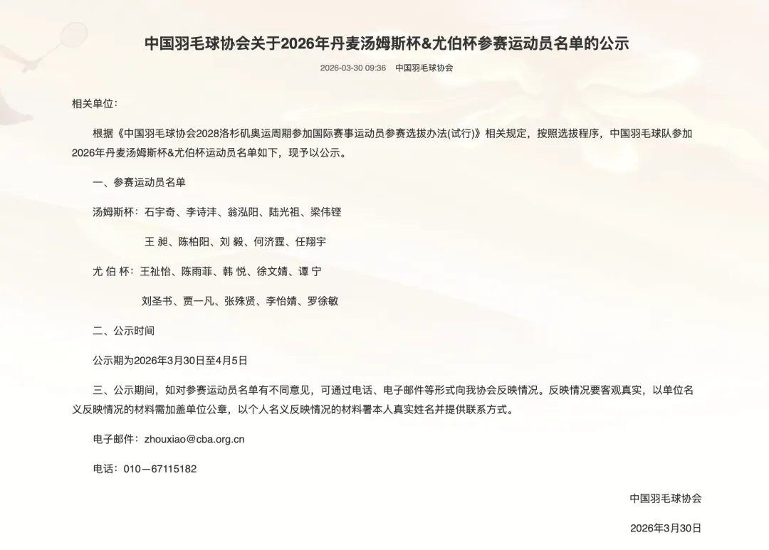 近日,中国羽毛球协会官网发布公告,公示了中国羽毛球队参加2026年丹麦汤姆斯杯&尤伯杯运动员的名单。其中,南京运动员徐文婧将代表中国队出战尤伯杯。