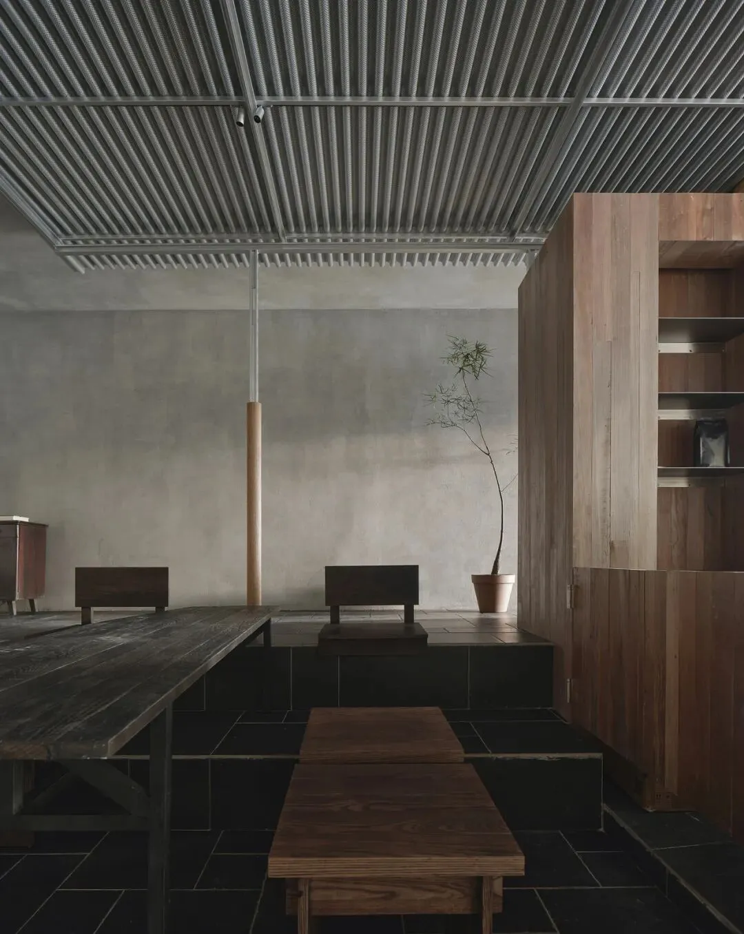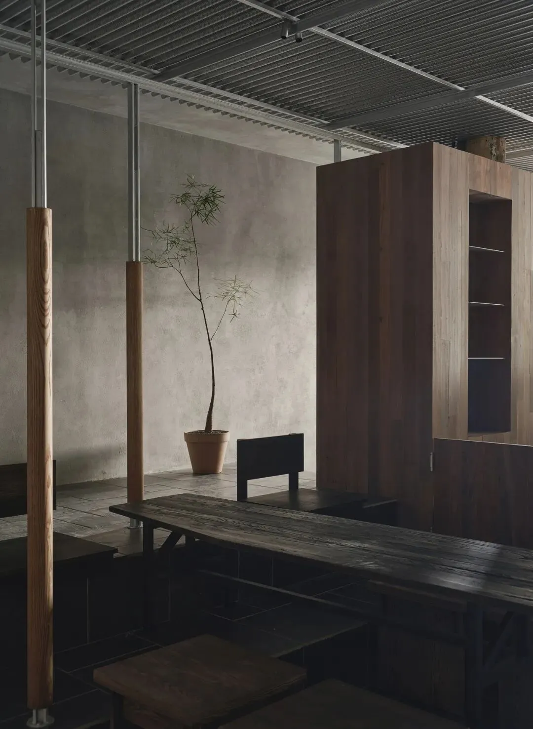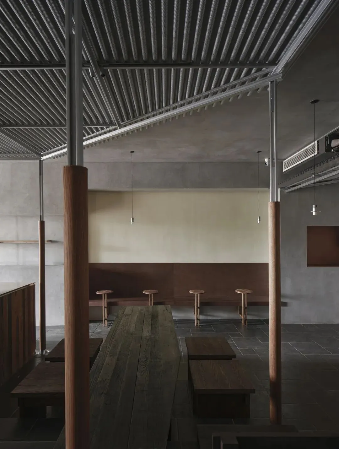 木构形式也被运用到家具节点上作视觉点缀,如卡座旁的小圆桌和定制长桌。在保持家具整体利落干净的形态同时增加些意趣。