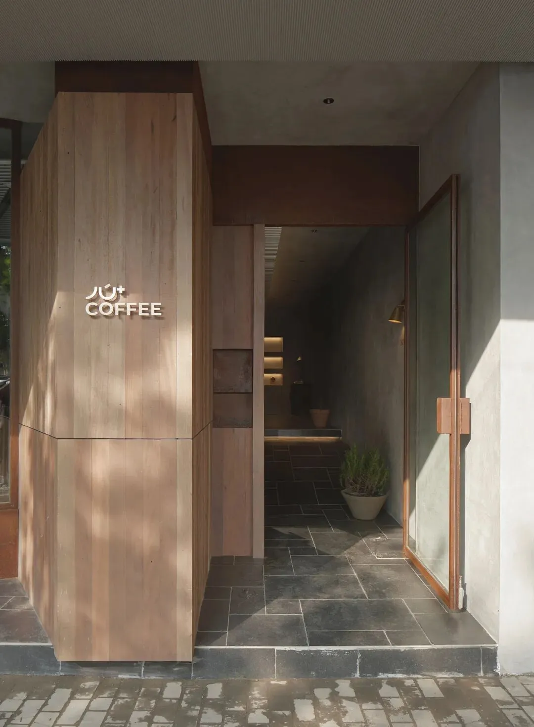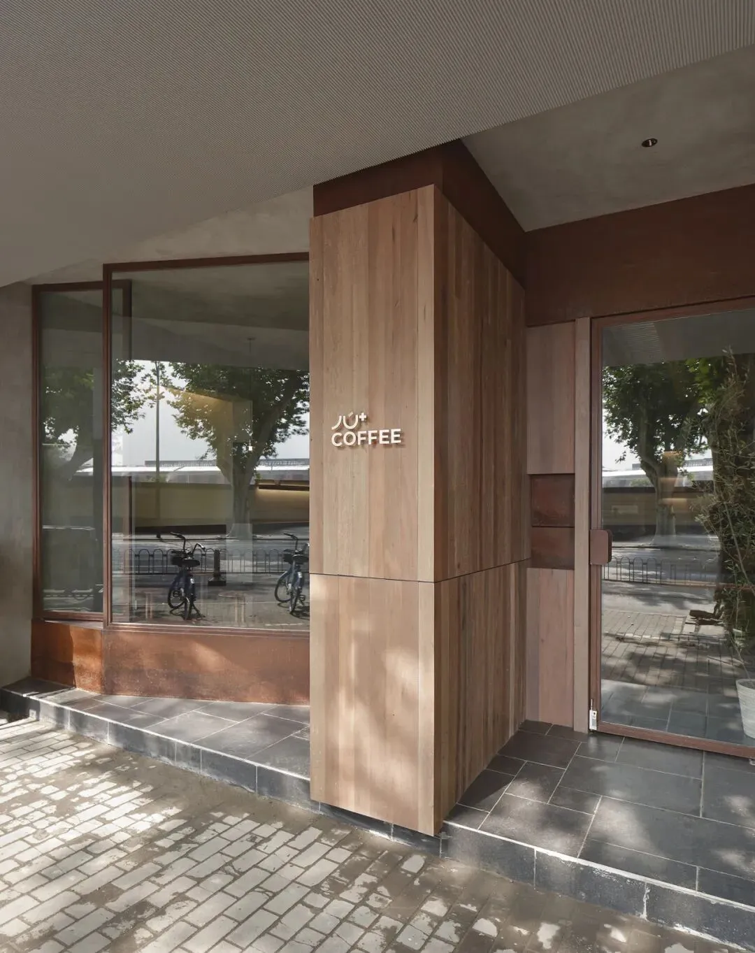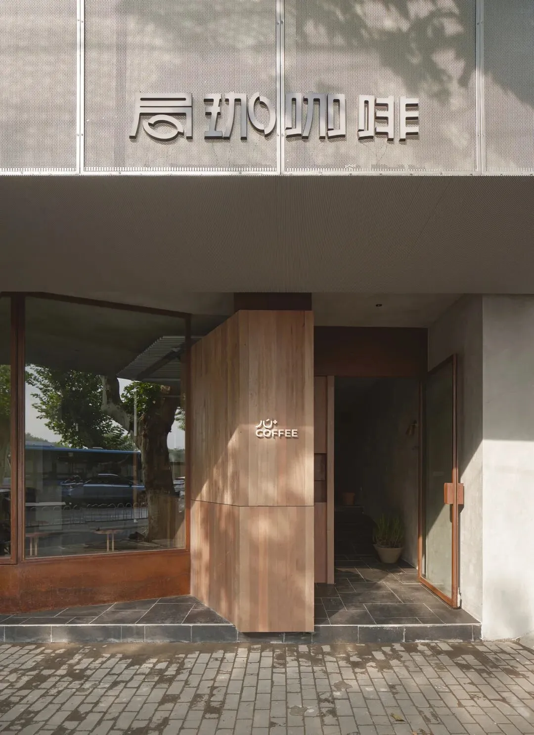 因此,立面材料选择了耐候钢板和老木材,突出质朴和易得性;门头材料做了更有“设计感”的安排,选择冲孔网来强化光线透出与视觉开放性。左侧立面窗口向内凹进,屋檐下灰空间配以围合卡座,呼应门口的梧桐树形成视觉焦点;右侧入口的窄门旁设置翻板小方窗,像以前院门上留给邮差投递报纸的小口。一方面便于外带顾客取餐,另一方面也使整个咖啡店的形象变得亲切。