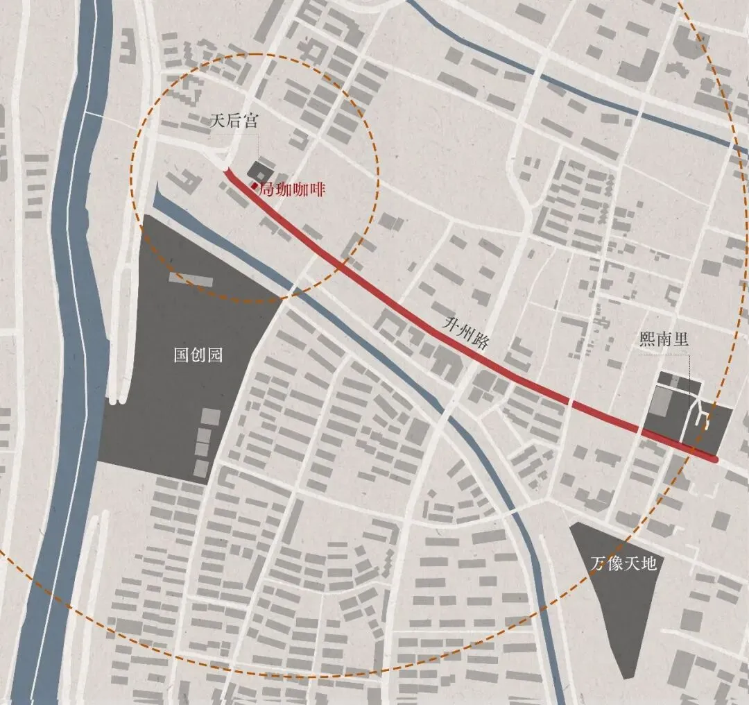 局珈咖啡位于南京老城南地区,周边围绕着一片明清时期风貌的民房。店铺面向升州路,道路两旁的榕树茂盛如伞盖一般,沿路步行五分钟就能到达秦淮河边。与店铺相距不足百米,在被隔壁写着“铜铝材”的蓝色招牌遮蔽的窄门内,藏着一座清代妈祖道观—天后宫。不同功能属性的房屋交织共生,形成了这片复杂的城市肌理。