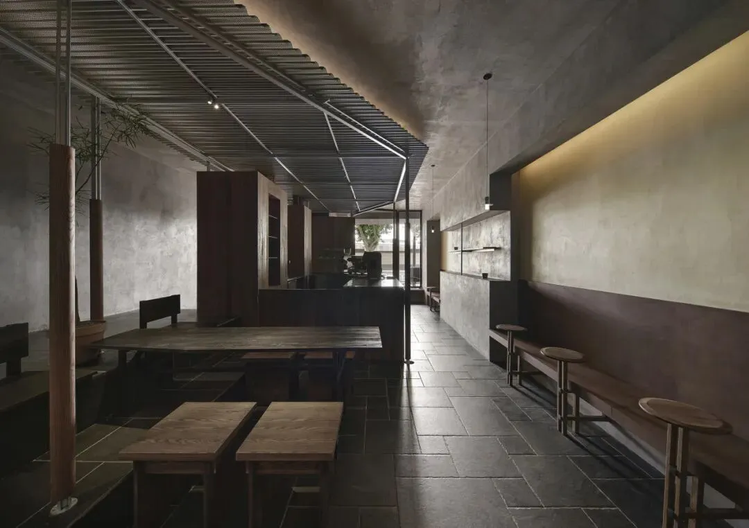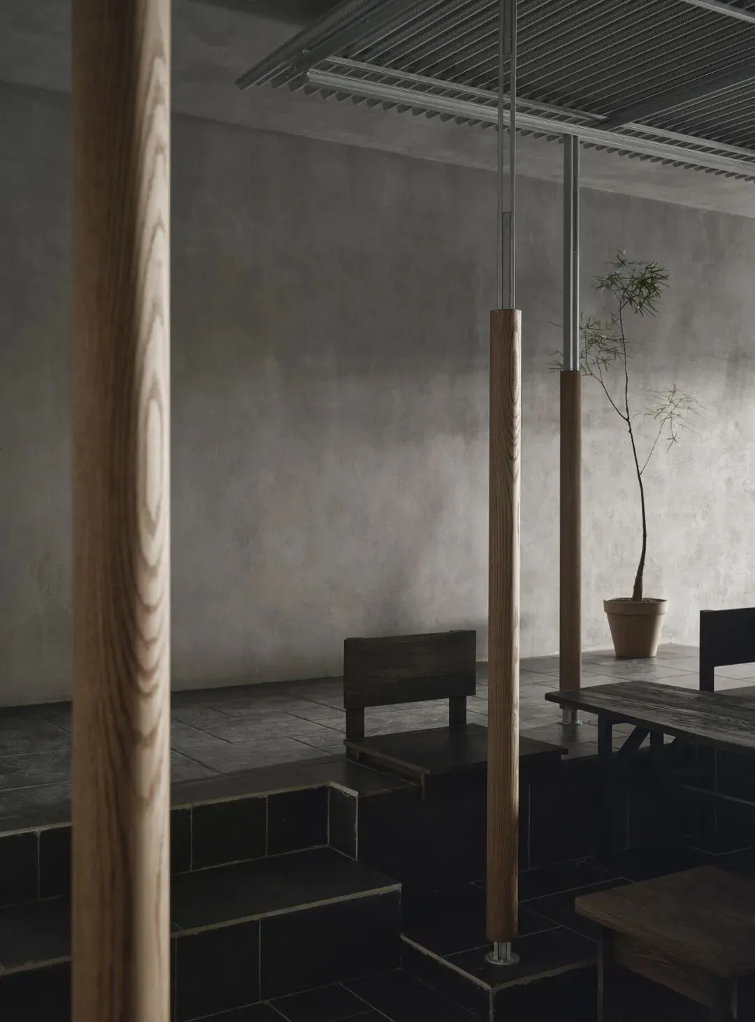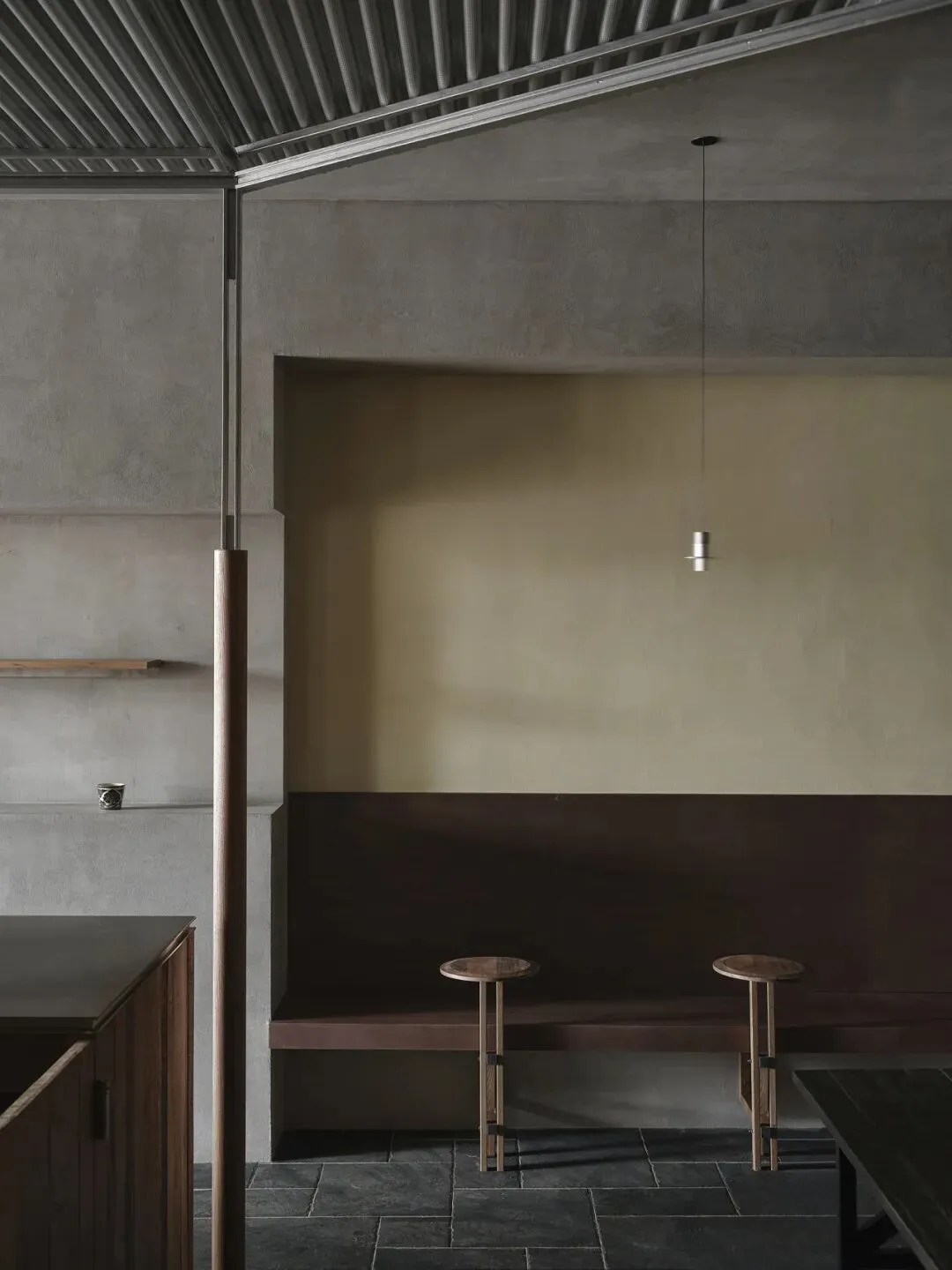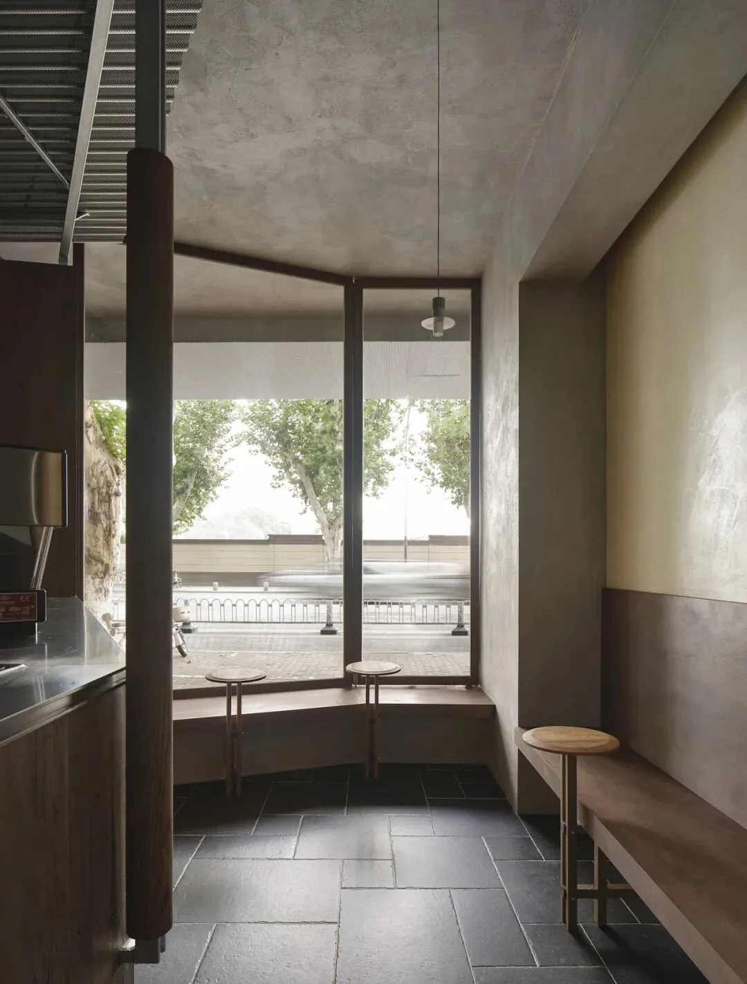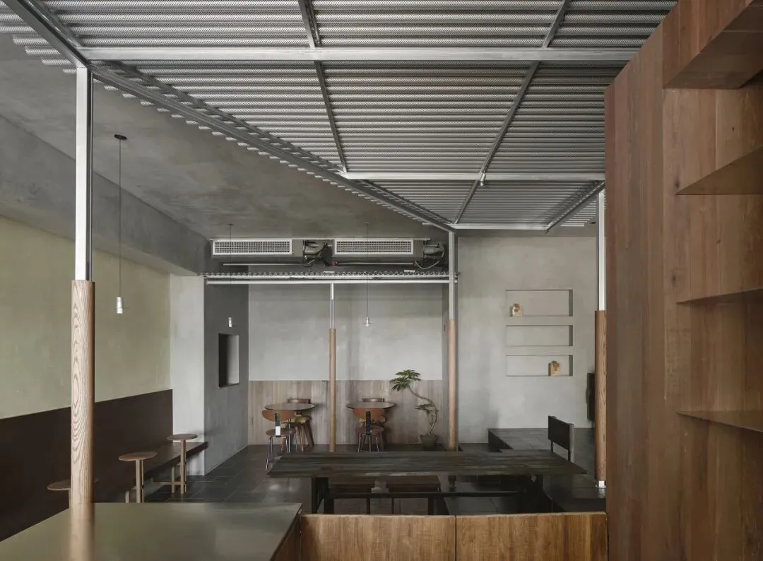 室内共出现两处雨棚,一处是吧台区,也是咖啡店能有公园感的核心要素;一处是在双人座位区,单坡雨棚在空间中划定了一个相对私密的区域,檐下立柱的存在强化了空间的构造秩序。