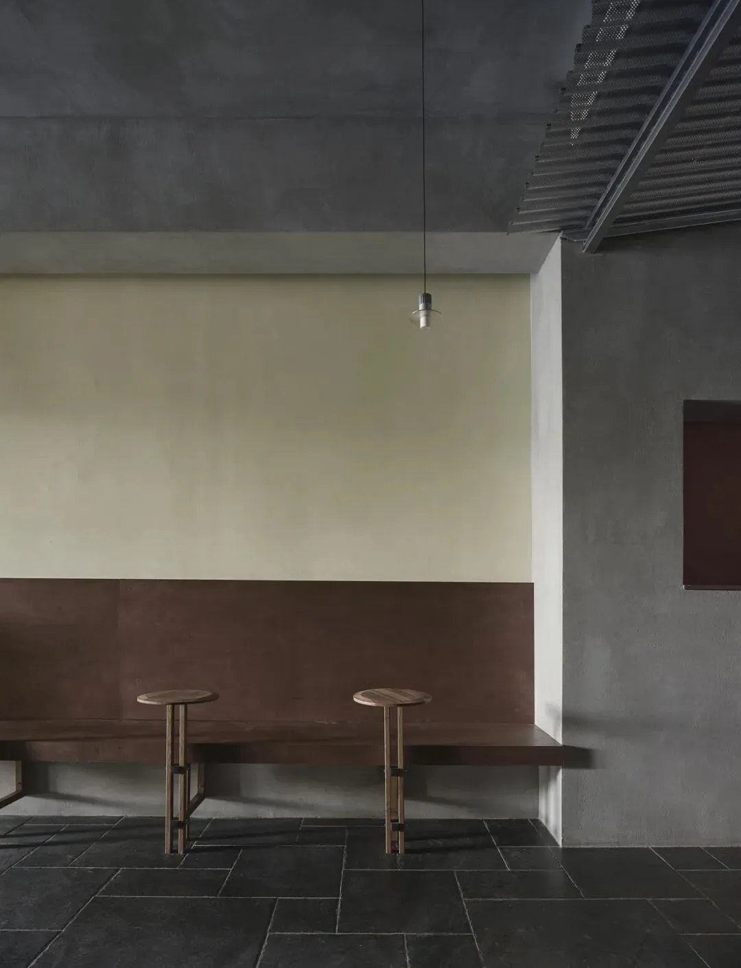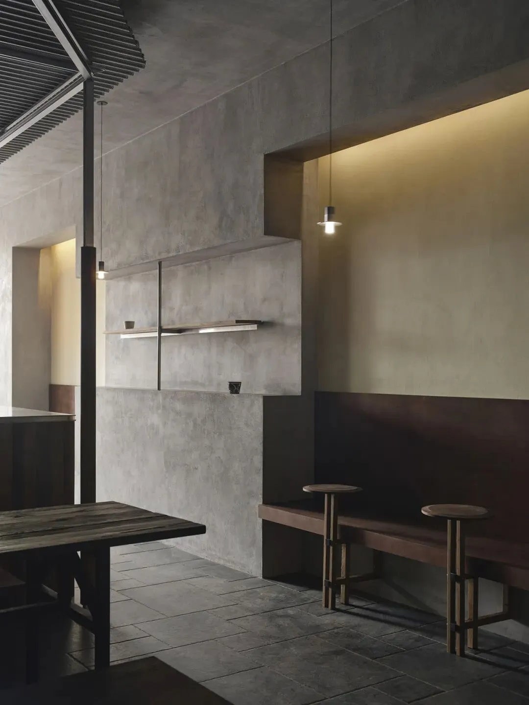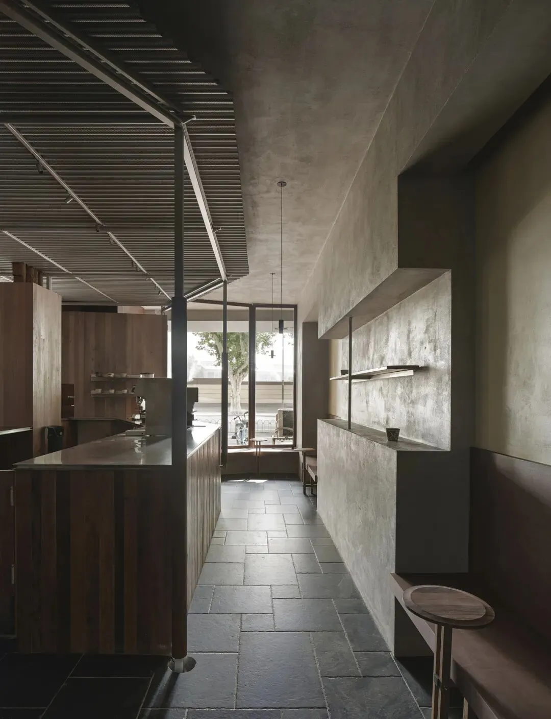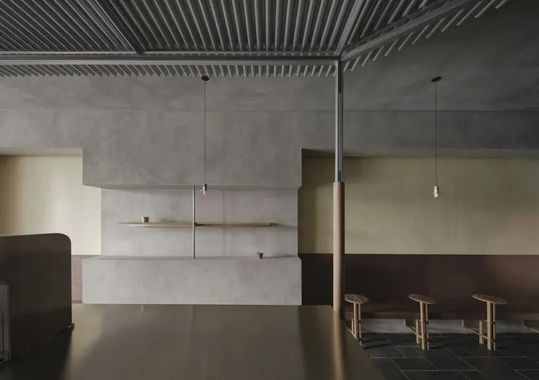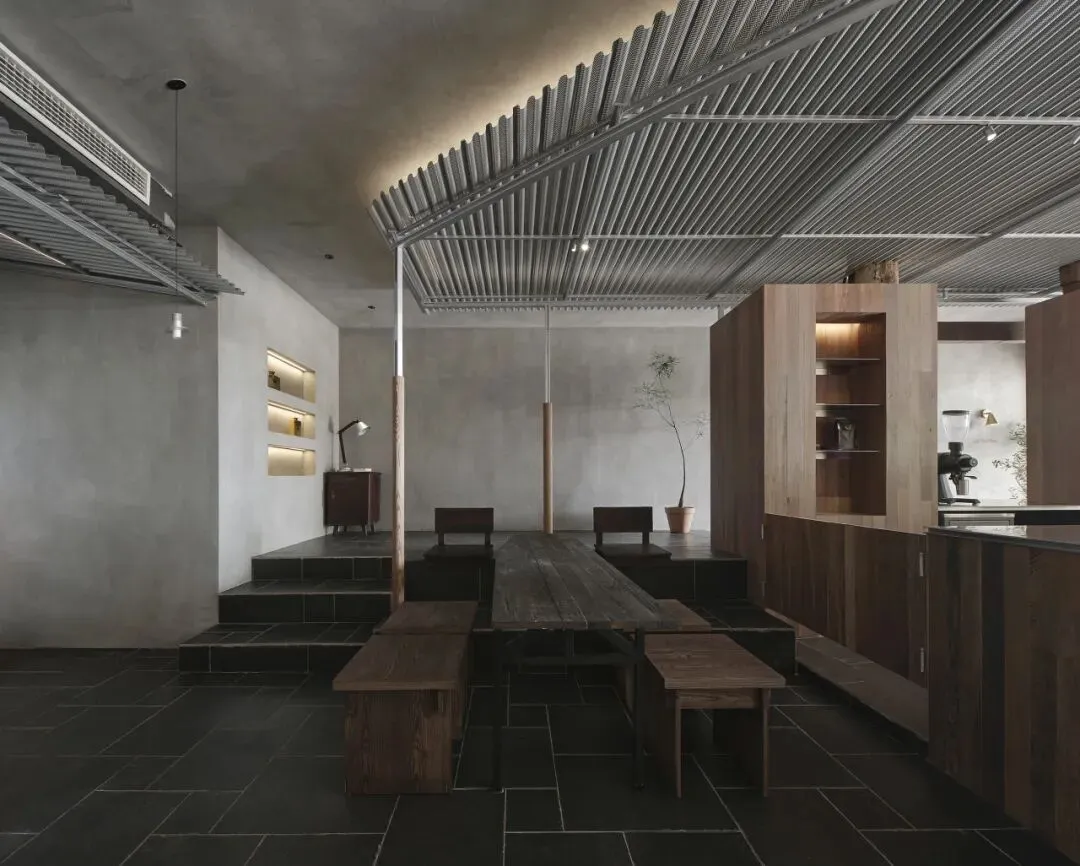 室内共出现两处雨棚,一处是吧台区,也是咖啡店能有公园感的核心要素;一处是在双人座位区,单坡雨棚在空间中划定了一个相对私密的区域,檐下立柱的存在强化了空间的构造秩序。