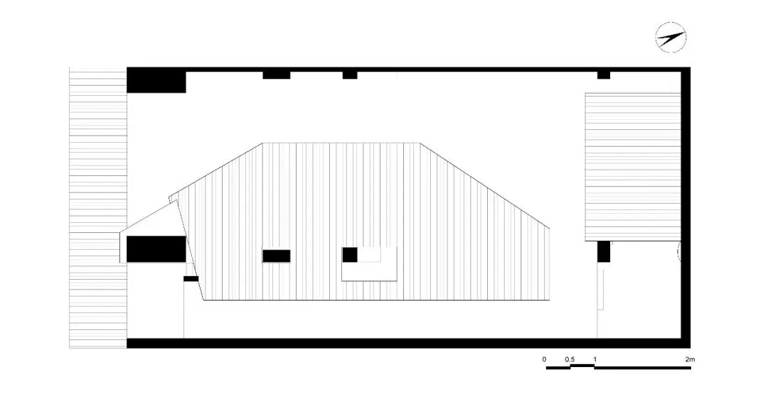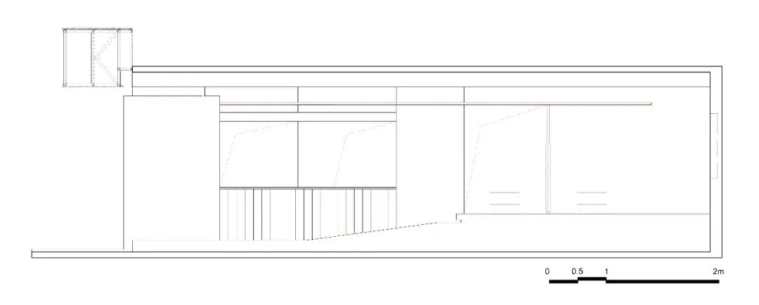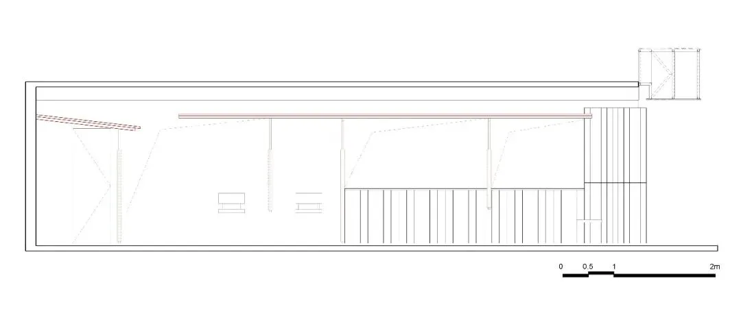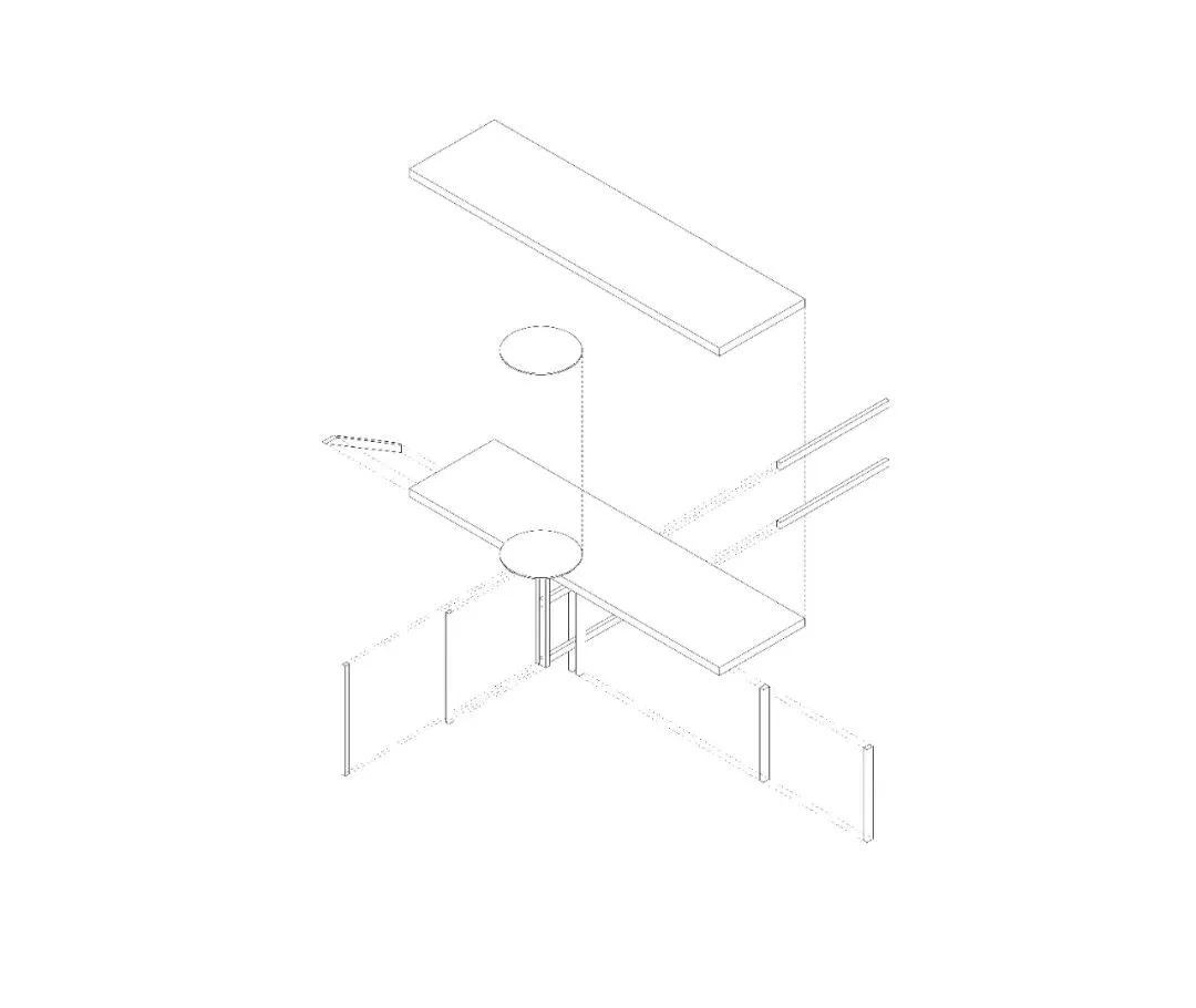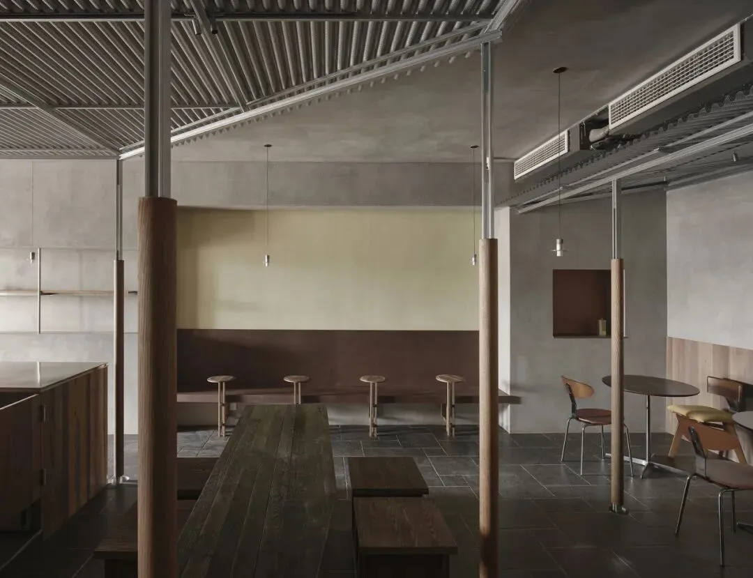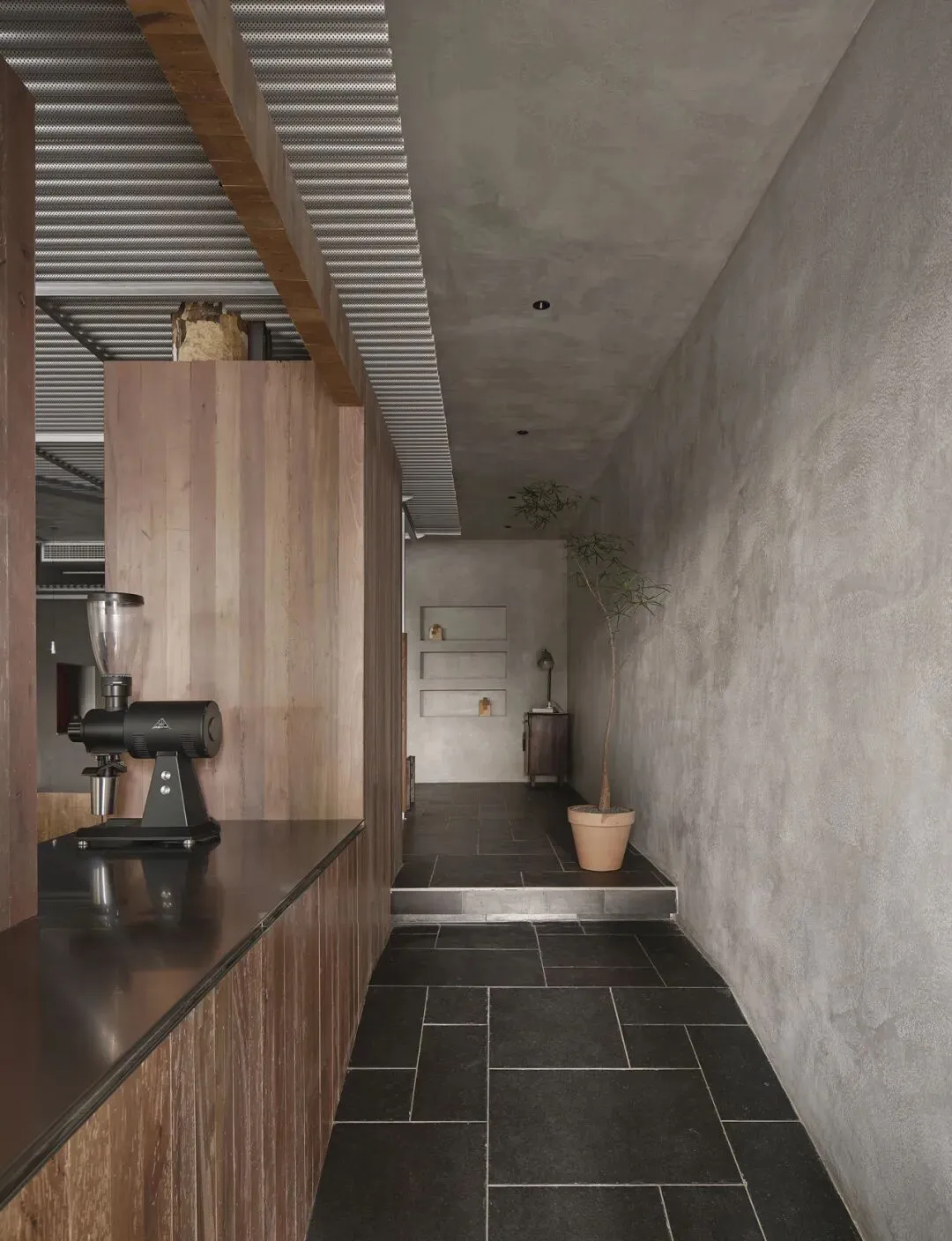 室内共出现两处雨棚,一处是吧台区,也是咖啡店能有公园感的核心要素;一处是在双人座位区,单坡雨棚在空间中划定了一个相对私密的区域,檐下立柱的存在强化了空间的构造秩序。