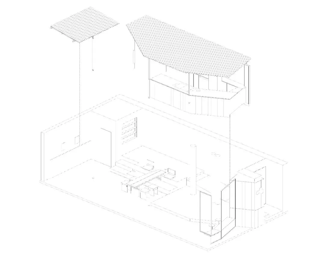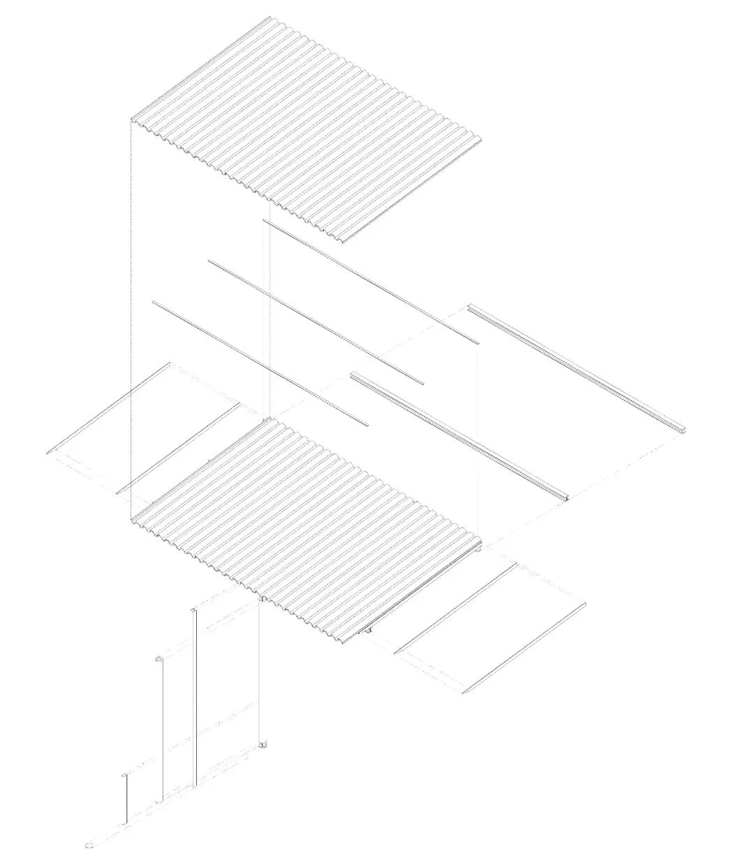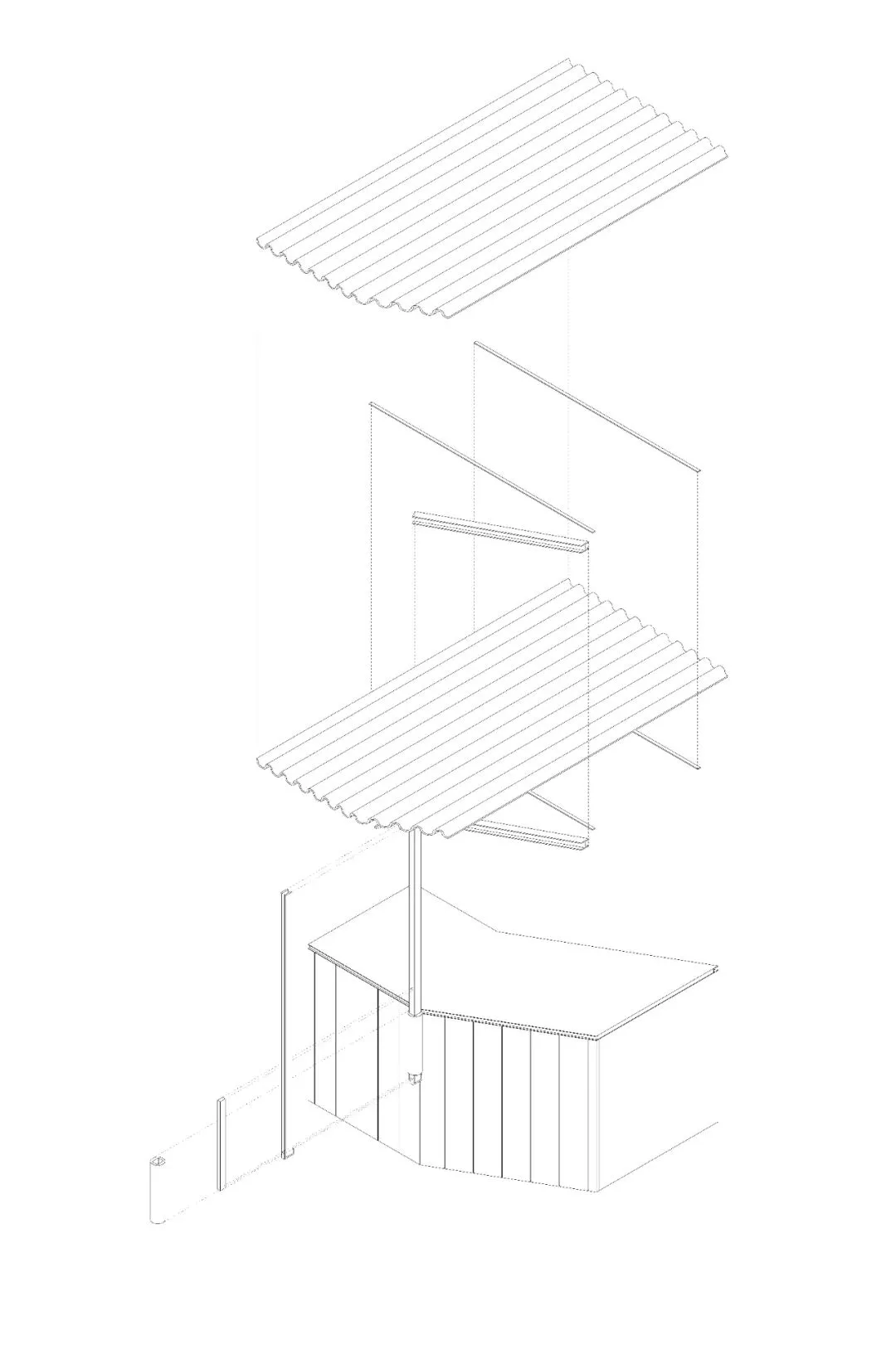 雨棚是在南京老城区街头随处可见的临建,比如自行车棚、报刊亭或生活阳台等等。我们选取雨棚形象作为设计元素来建立室内与街巷的联结,保持视觉记忆的连续性。