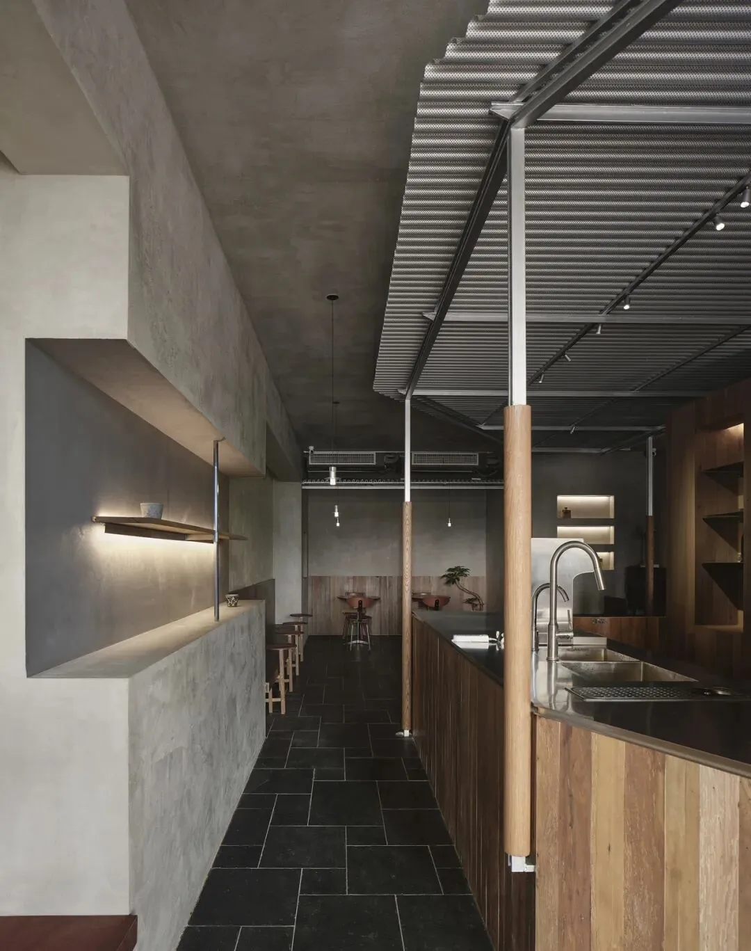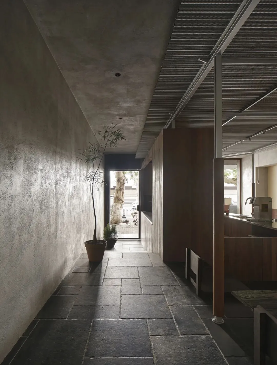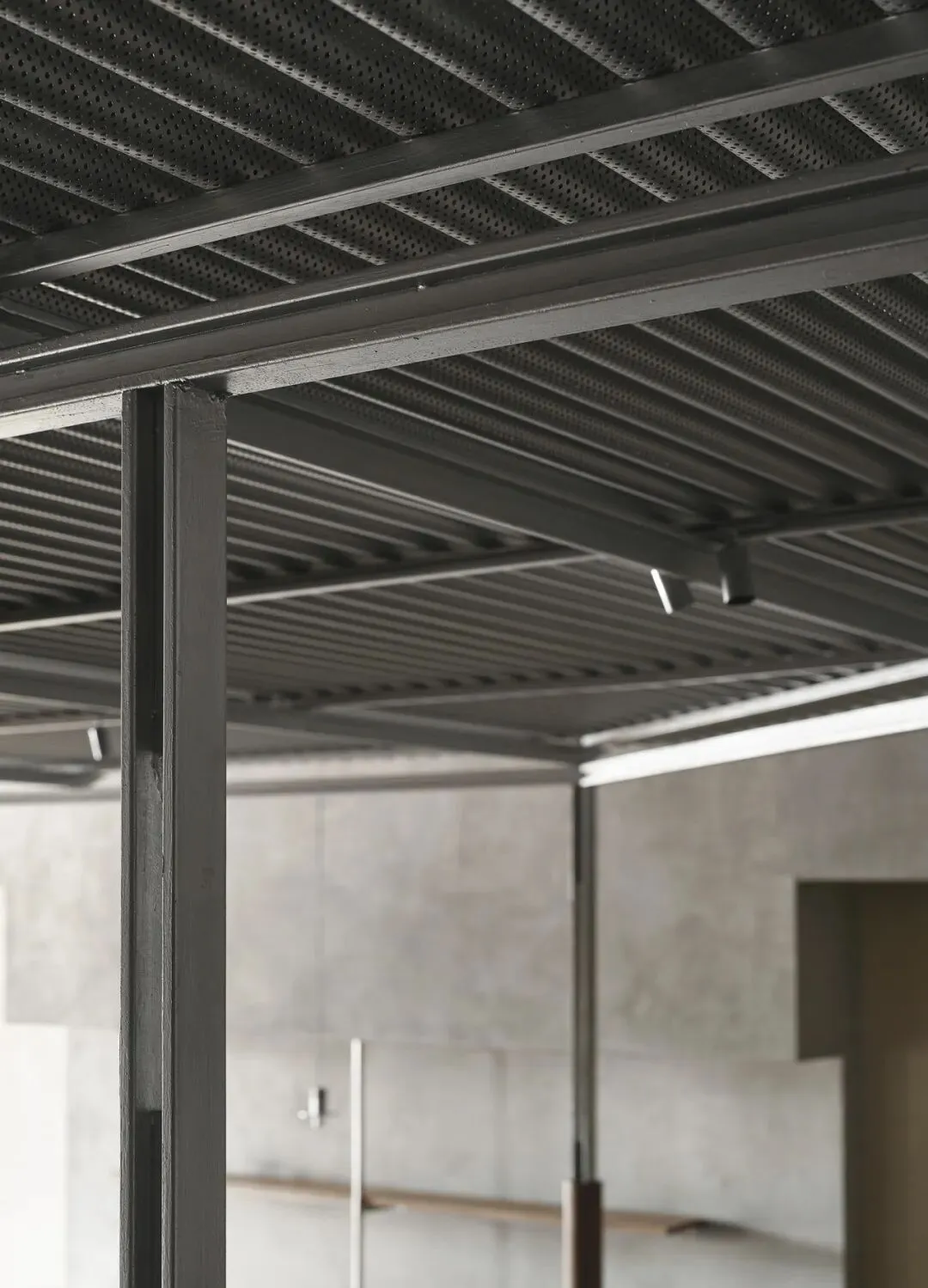 “雨棚”的屋面采用波浪形冲孔铝板来提升透光性和空气流动性,稀释了其他材料带来的厚重感,使空间氛围更加当代。
